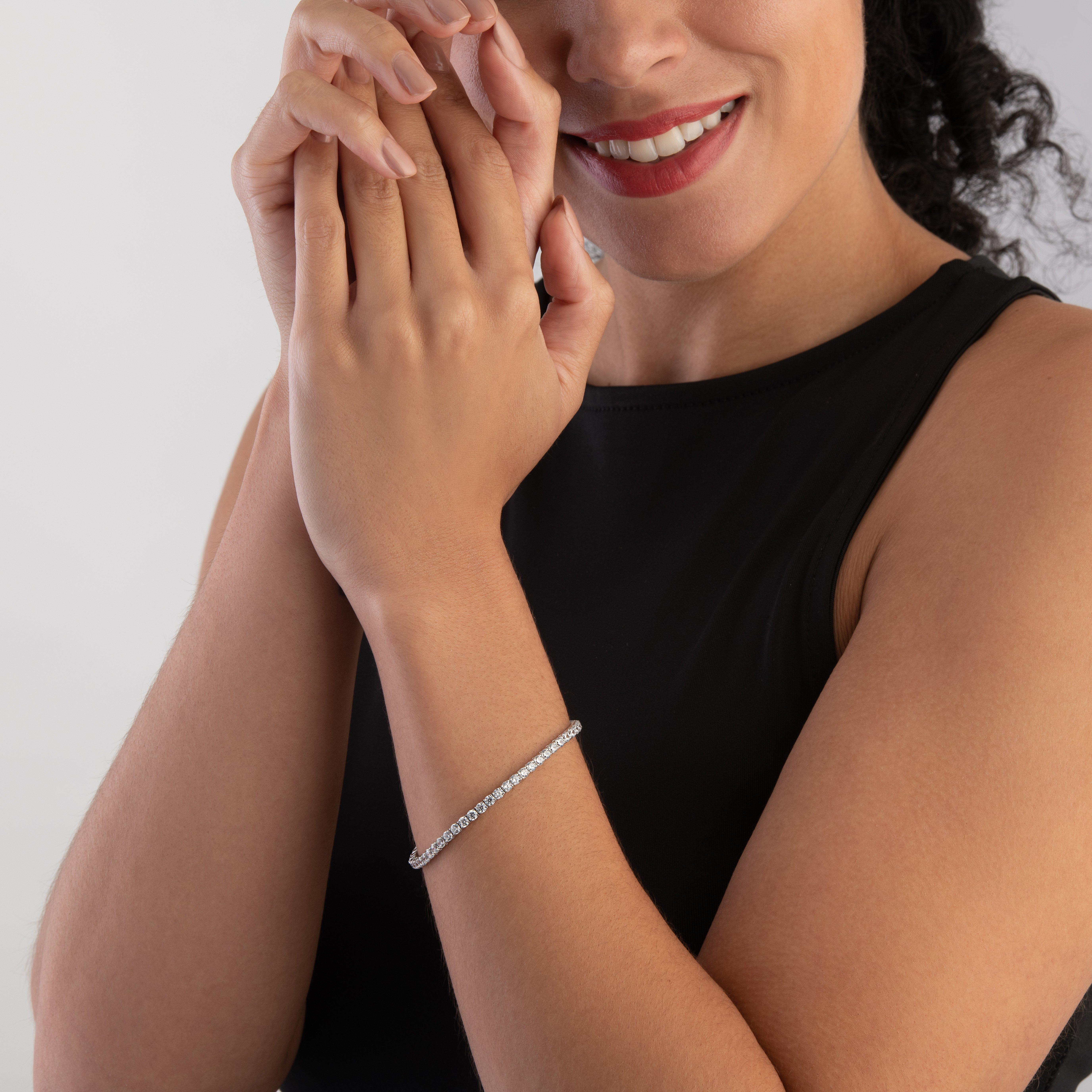 This 9ct White Gold bracelet trimmed in Cubic Zirconia is a gift that will surprise and impress her. The brilliance of the cubic zirconia highlights the refined quality of this 9ct White Gold bracelet. She will love how this bracelet looks and feels on her wrist. bracelet length 20cm, bracelet width 3mm.