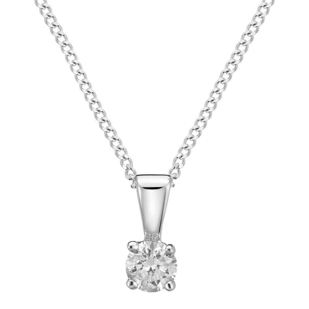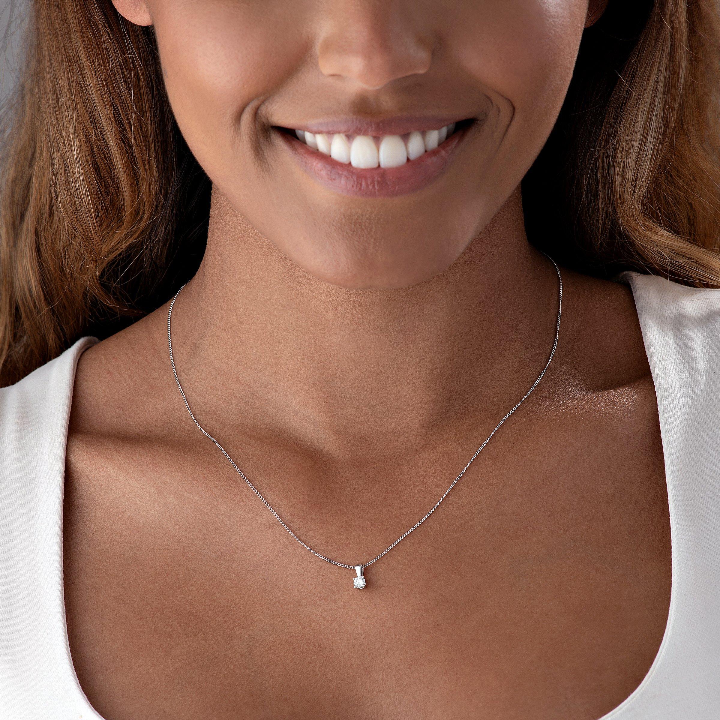 Simply stunning, this 18ct white gold diamond pendant will never go out of style. A timeless classic, this design is made in 18ct white gold and features a delicate chain that holds the dazzling round brilliant diamond that sparkles from every angle with incredible fire and brilliance. Every girl deserves a diamond, and this lovely pendant is the perfect way to ensure you feel nothing but glamorous at all times. Diamond information: Cut - round brilliant, Colour - I, Clarity - I1, Carat weight - 0.20ct.. Please note there could be a 5% variance on the diamond carat weight, as every diamond is unique.
