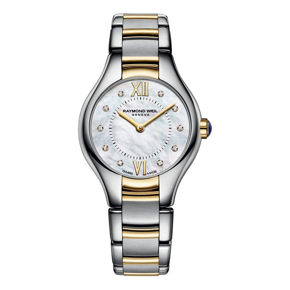 Strength meets femininity in this exceptional RAYMOND WEIL Noemia diamond watch whose delicate details create a style that is both sweet and desirable. Fastened with a stainless steel and PVD gold plated bracelet with folding clasp and double push-security system, the delicate 24mm stainless steel case features an elegant polished bezel and a crown with distinctive gold plated and blue lacquered finish. Protected by sapphire crystal glass, the pretty white mother of pearl dial is brought to life by the 10 sparkling diamonds set on the hour markers and the bold golden Roman numerals at 12 and 6 o'clock. Water resistant to 50m, this stunning watch is powered by a precision quartz movement. Beautifully finished, RAYMOND WEIL uses centuries of carefully handed down Swiss watchmaking skills to create this exceptional design. 5124-STP00985