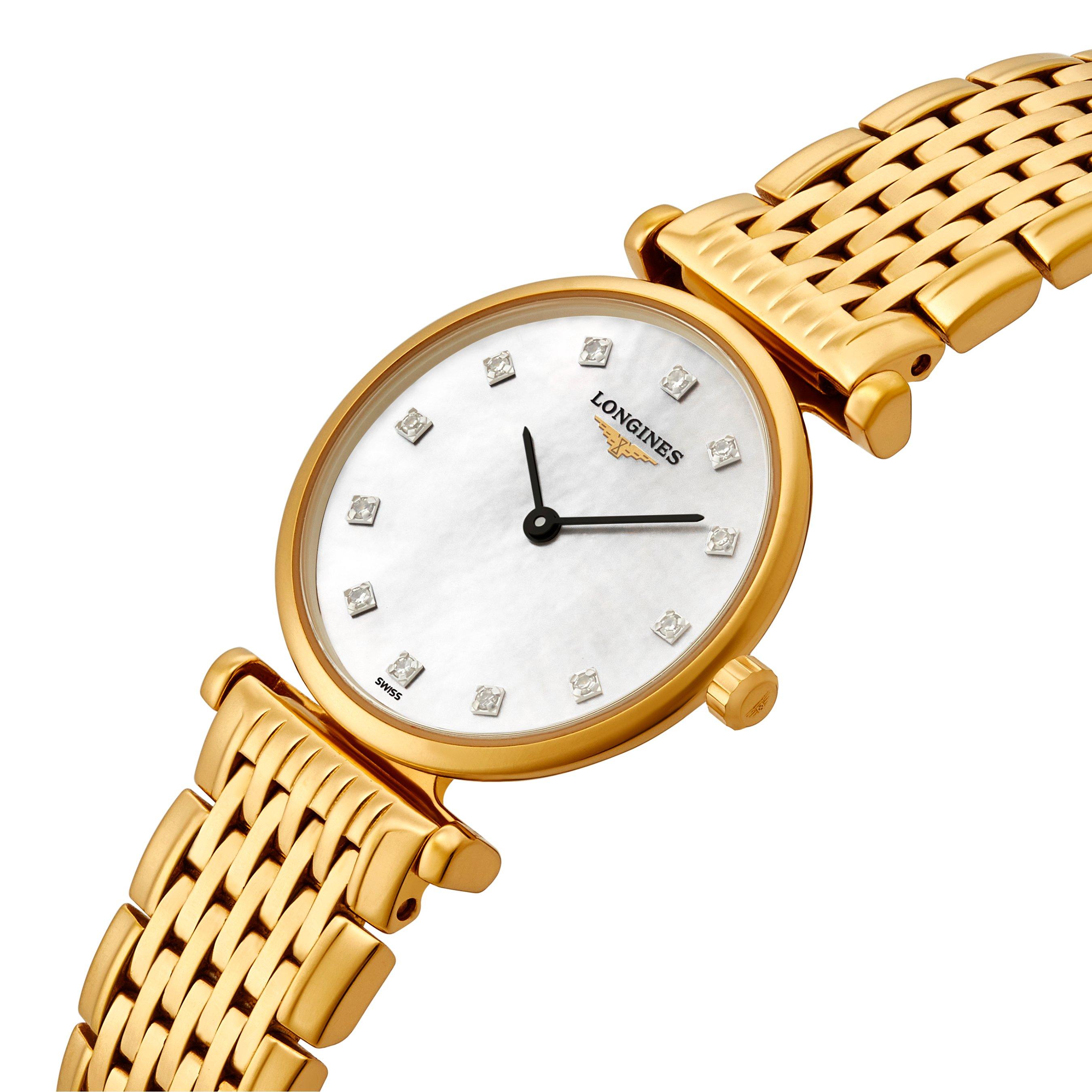 Simply beautiful, this luxurious PVD gold plated Longines La Grande Classique 24mm Yellow Gold PVD Diamond Ladies Watch is the epitome of style and glamour. Fastened with an elegant and vintage-inspired PVD gold plated stainless steel bracelet with triple folding security clasp and push-piece opening mechanism, the 24mm PVD gold stainless steel case has a refined polished bezel which accentuates its delicate and feminine style. Beneath the scratch-resistant sapphire crystal, the pretty white mother of pearl dial features delicate black hands, and is brought to life with 12 Wesselton VS diamonds set on the hours. Water resistant to 30m, this stylish watch is powered by a Calibre L209 quartz movement. Maintaining all the characteristics of the original timepieces that inspired this collection, this stunning watch has an ultra-slim profile that makes it very easy-to-wear. L4.209.2.87.8