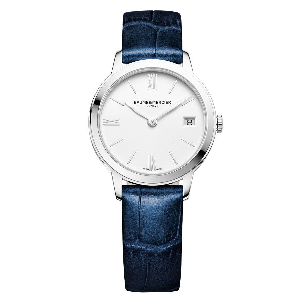 A classic timepiece with contemporary style, this Baume & Mercier Classima 31mm Ladies Watch will enhance your everyday look with modern elegance. Featuring a glossy blue leather strap with an alligator pattern, paired with a confident white dial for a luxurious addition to every watch collection.