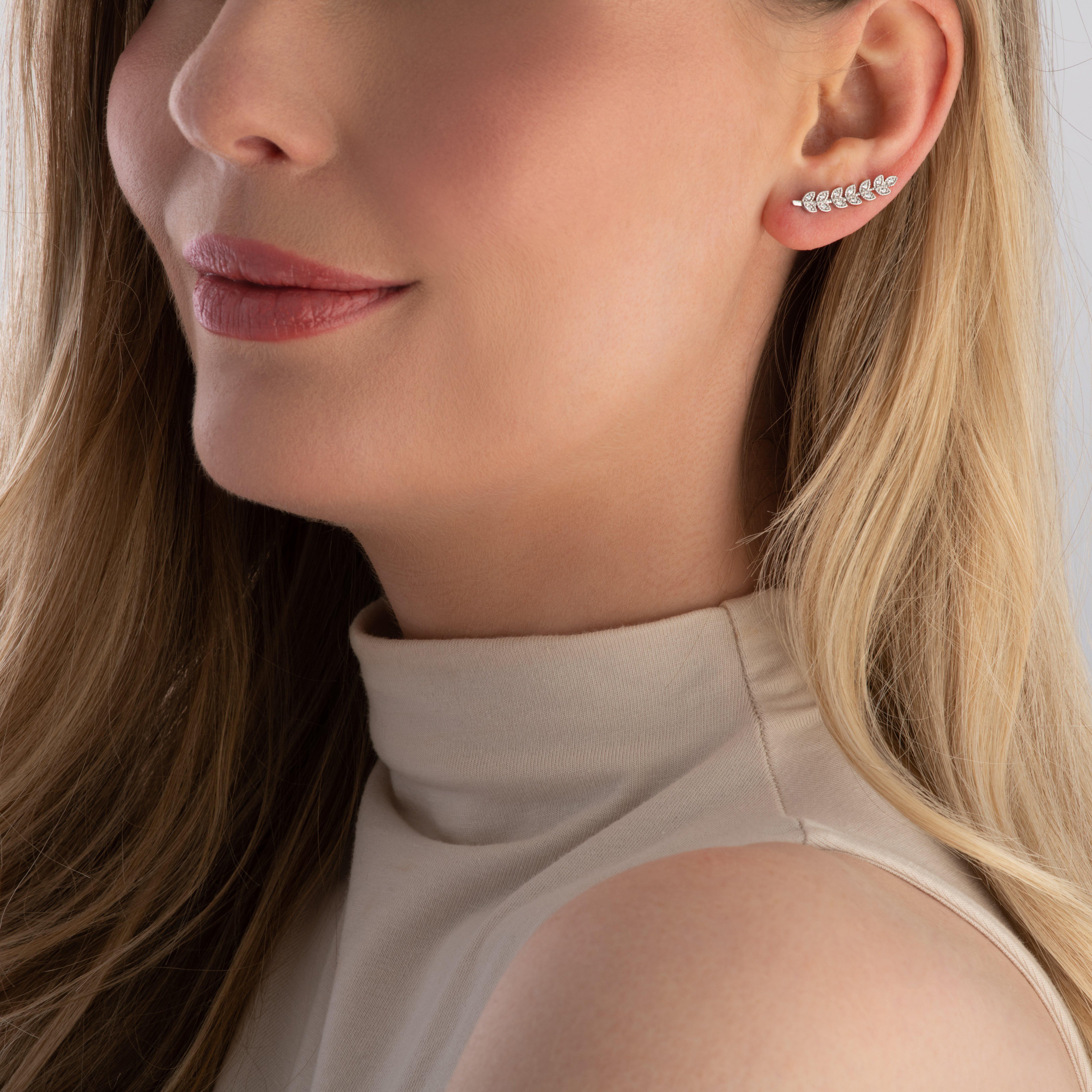 Femininity meets fashion for these beautiful silver cubic zirconia leaf climber earrings. These nature-inspired earrings are designed in silver and showcase a pretty leaf pattern that climbs up your ear and glitters with a stunning cubic zirconia embellishment. Add natural beauty to your look with these gorgeous climber earrings.
