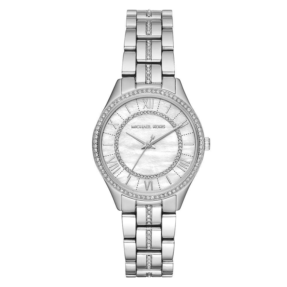 This gorgeous watch is fastened with a polished bracelet with a dazzling embellishment and features a 33mm stainless steel case with more sparkle around the bezel. The round face displays a pretty mother of pearl dial that's enhanced by Roman numeral hour markers, silver tone hands and a glittering finish. Water resistant to 50m, this watch is powered by a quartz movement. Dress up your look from work to weekend with this stunning Michael Kors watch. MK3900