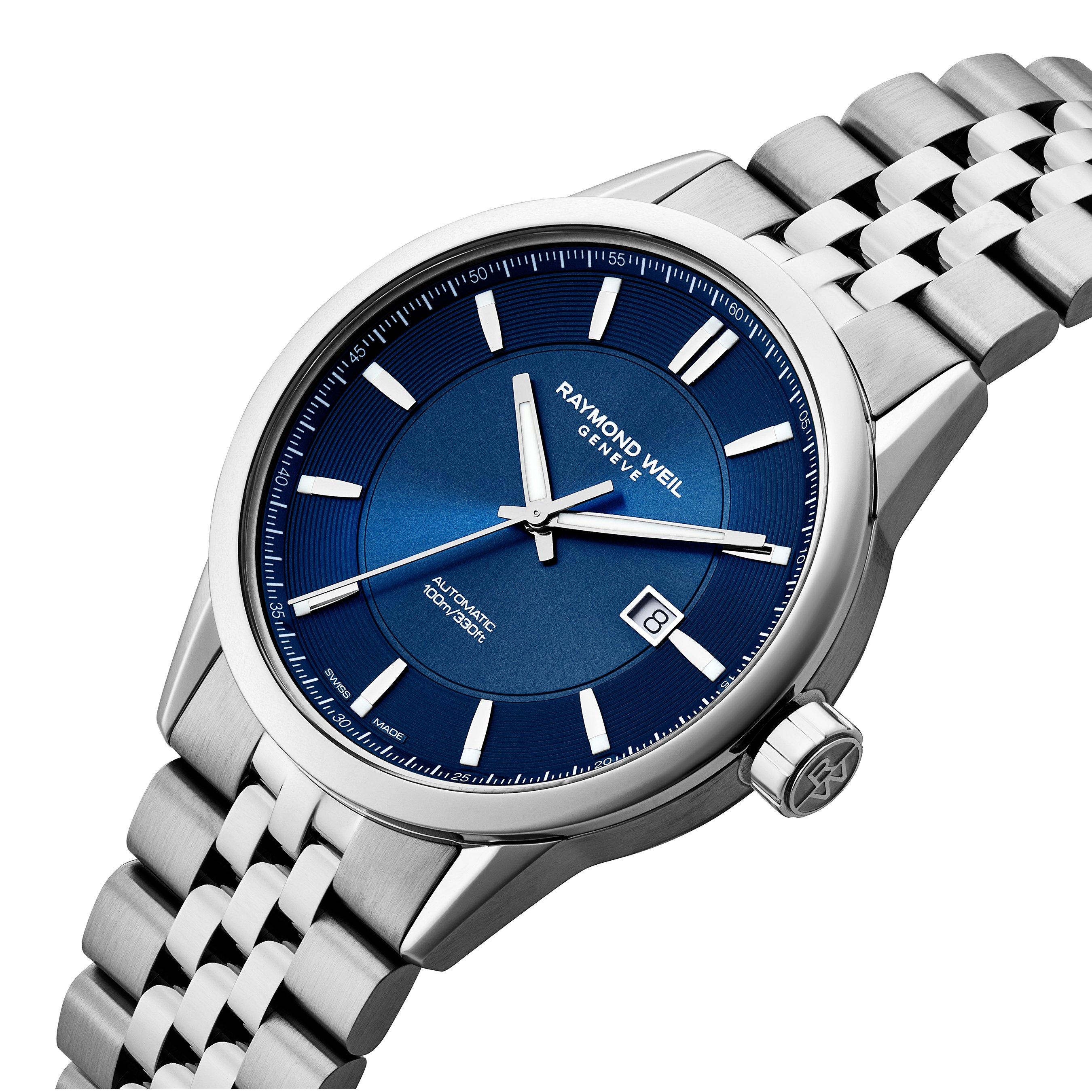 Scratch-resistant sapphire crystal protects the blue sunray dial, enhanced by baton hour markers, silver tone hands and a date window at 3 o'clock. Water resistant to 100m, this watch is powered by an in-house mechanical movement. A truly timeless watch, this RAYMOND WEIL Freelancer is a modern classic. 2731 -ST -50001