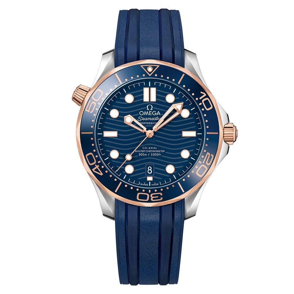 - 42mm stainless steel case with an 18ct rose gold and blue ceramic unidirectional rotating bezel and 300m water resistance
