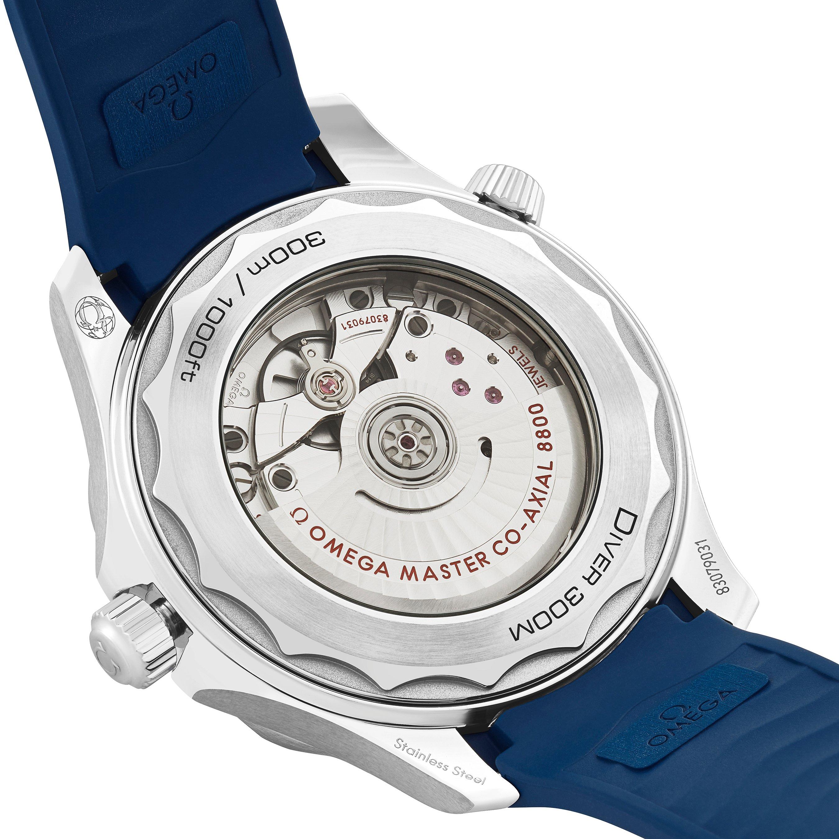 - 42mm steel case with a blue ceramic bezel with a white enamel diving scale and 300m water resistance