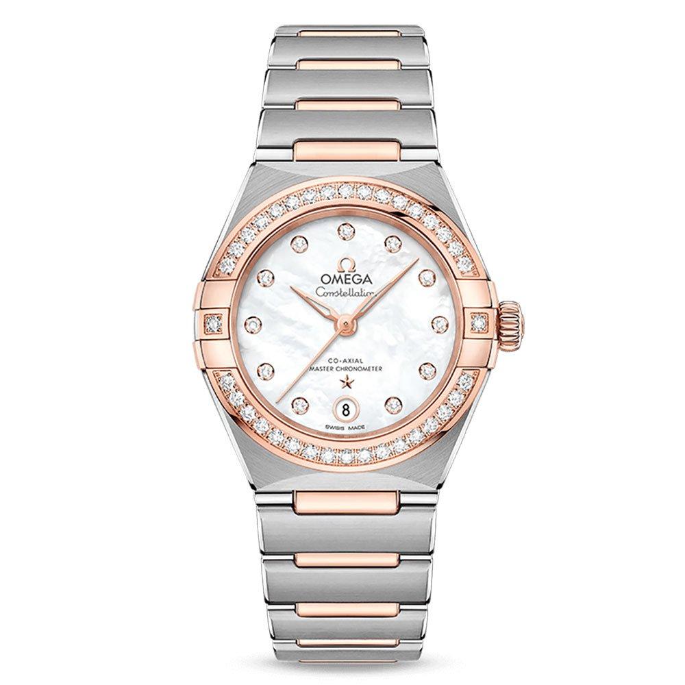 Characterised by its famous half-moon "claws" on the case, this OMEGA Constellation 29mm 18K Sedna Gold Diamond Automatic Ladies Watch is loved for its modern use of mixed metal and the glittering diamonds for a touch of luxury.