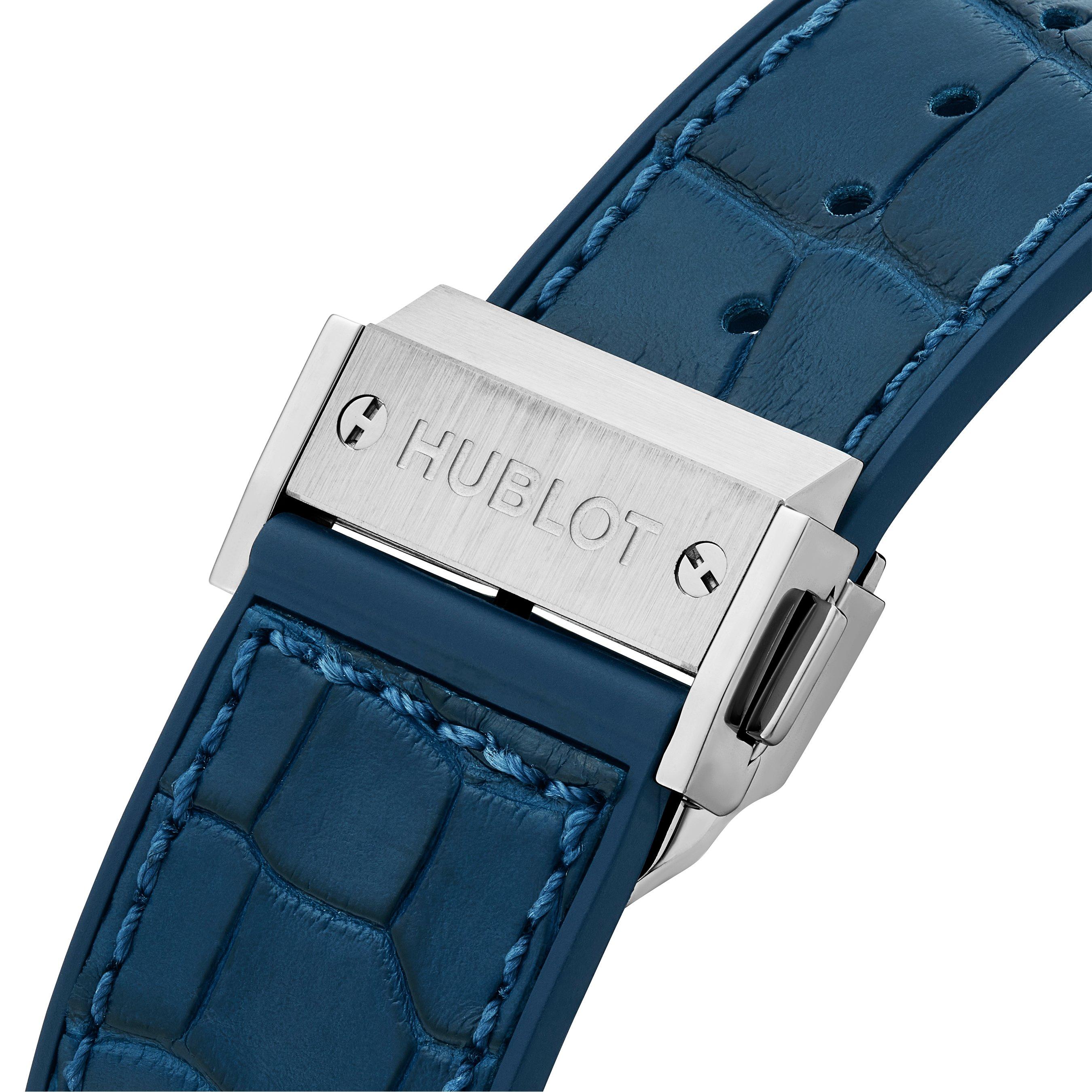 - Presented on a blue rubber and alligator leather strap with stainless steel deployment buckle clasp