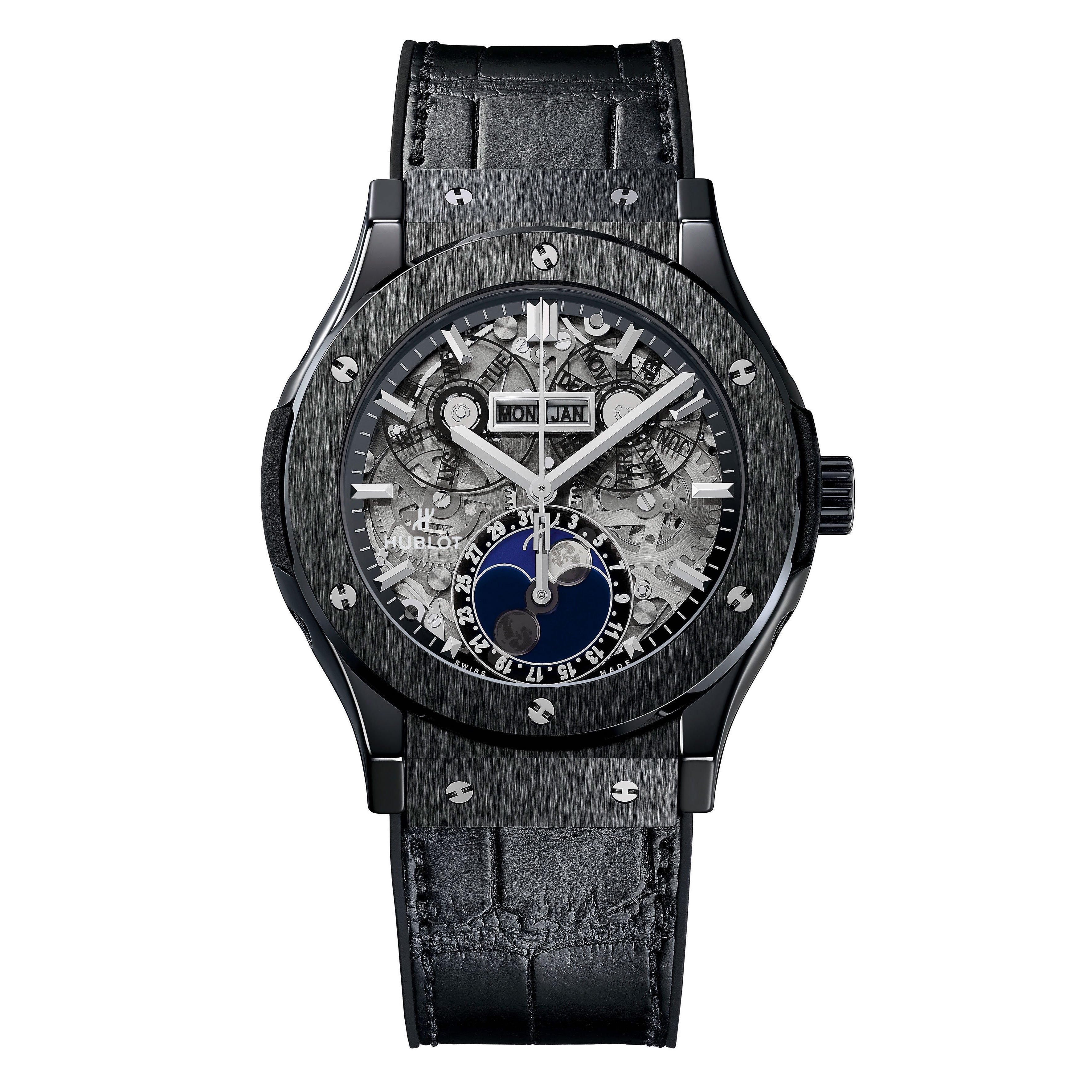 A modern and contemporary take on a classic design, this Hublot Classic Fusion Aerofusion Moonphase 45mm Ceramic Automatic Watch redefines the codes of timeless elegance. The stunning skeleton dial proudly reveals the high-tech inner workings at the heart of this luxurious timepiece.
