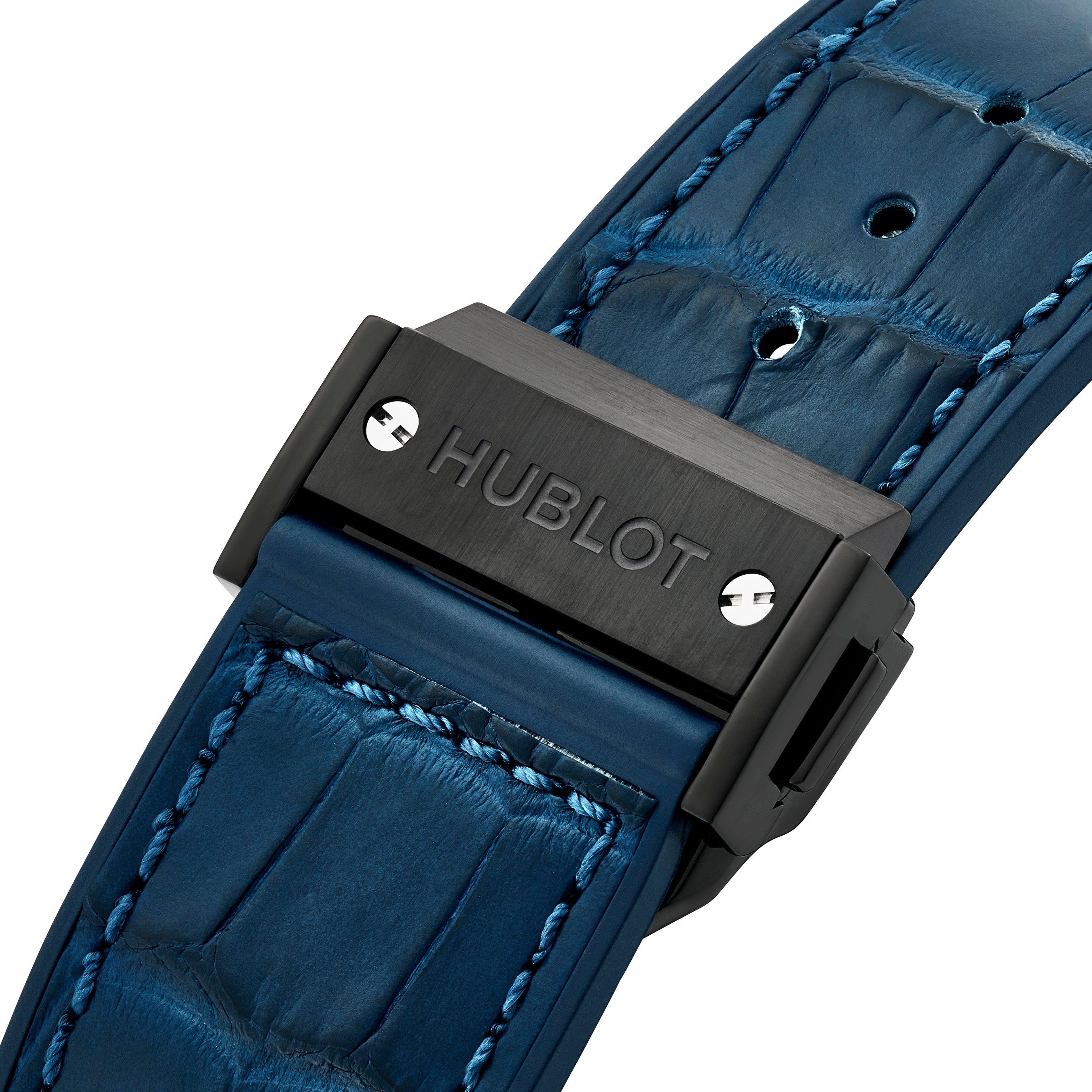 - Presented on a blue rubber and alligator leather strap with black plated stainless steel deployment buckle clasp