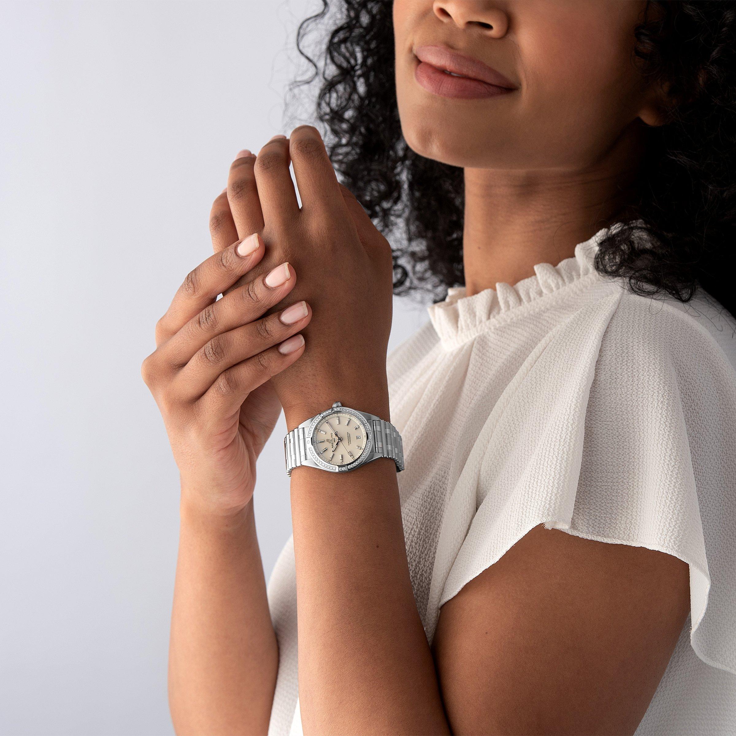 - 32mm stainless steel case with a diamond bezel and 100m water resistance