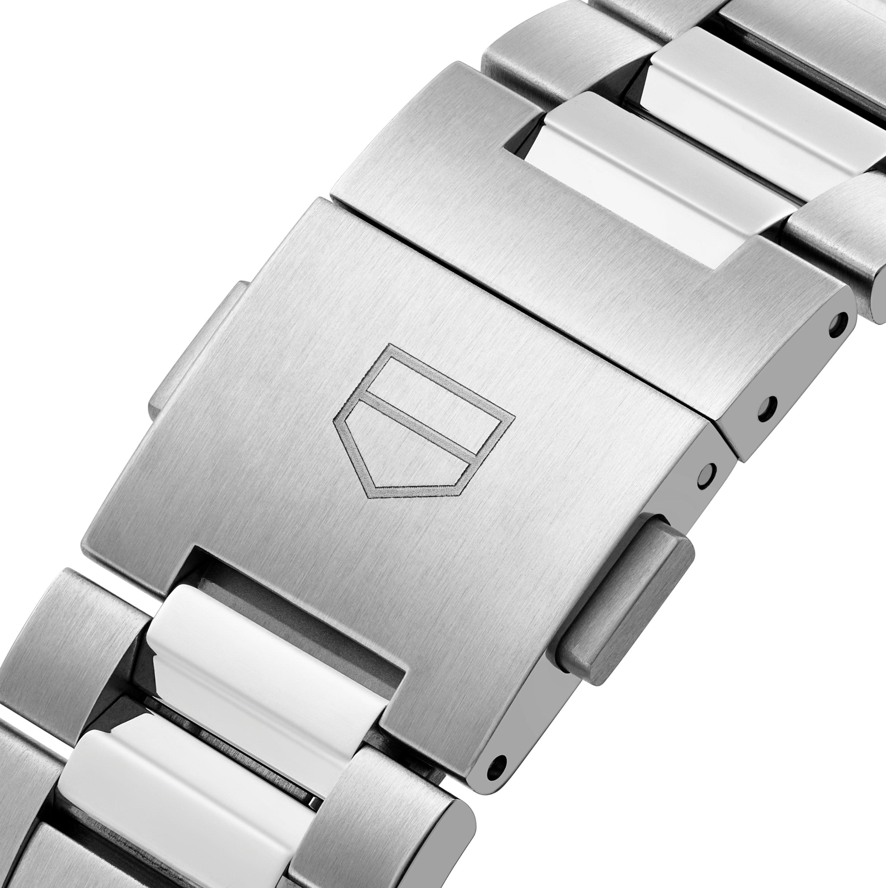 - Presented on a steel H-shaped bracelet with folding clasp and double safety push buttons plus TAG HEUER applied logo