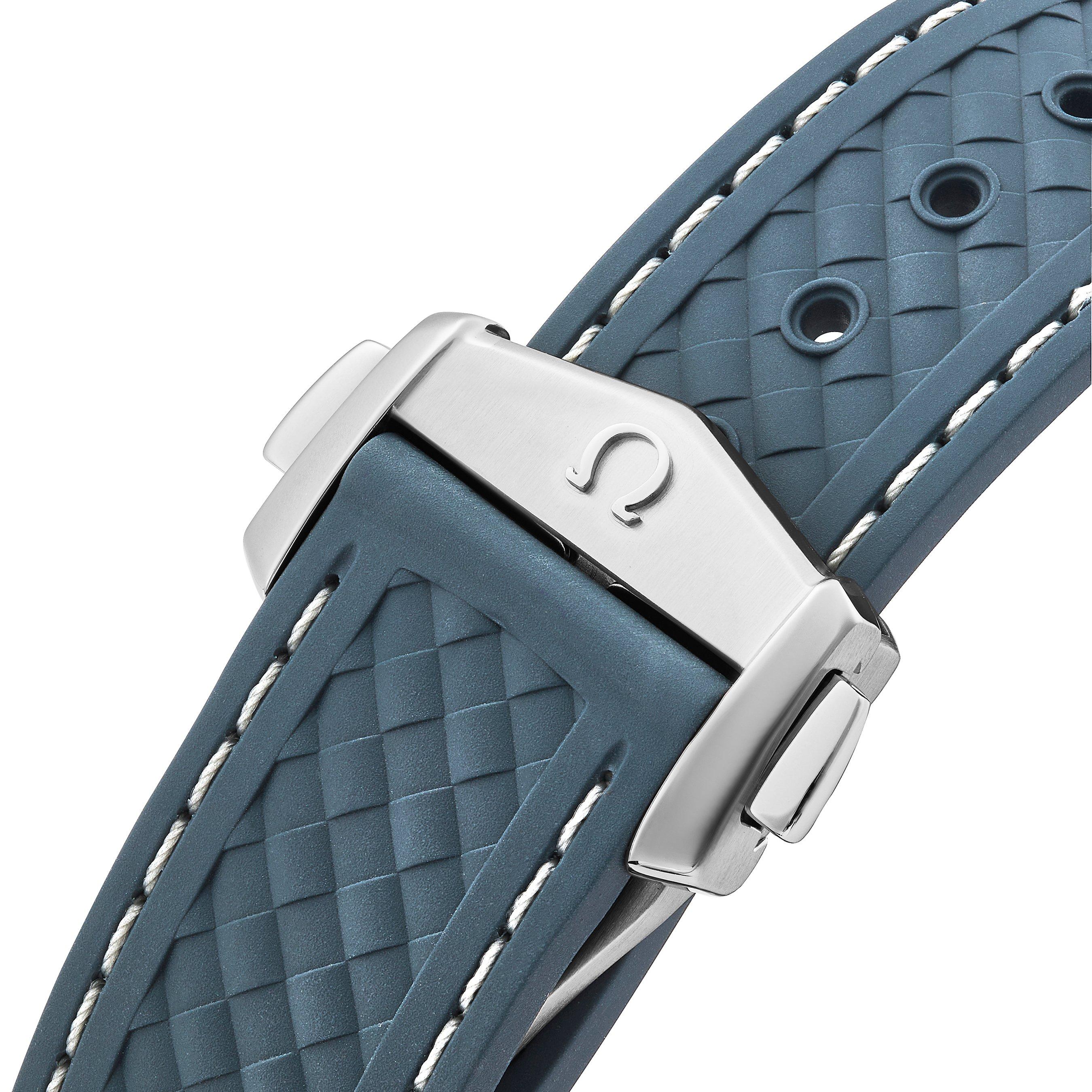 - Presented on a structured blue rubber strap with grey stitching