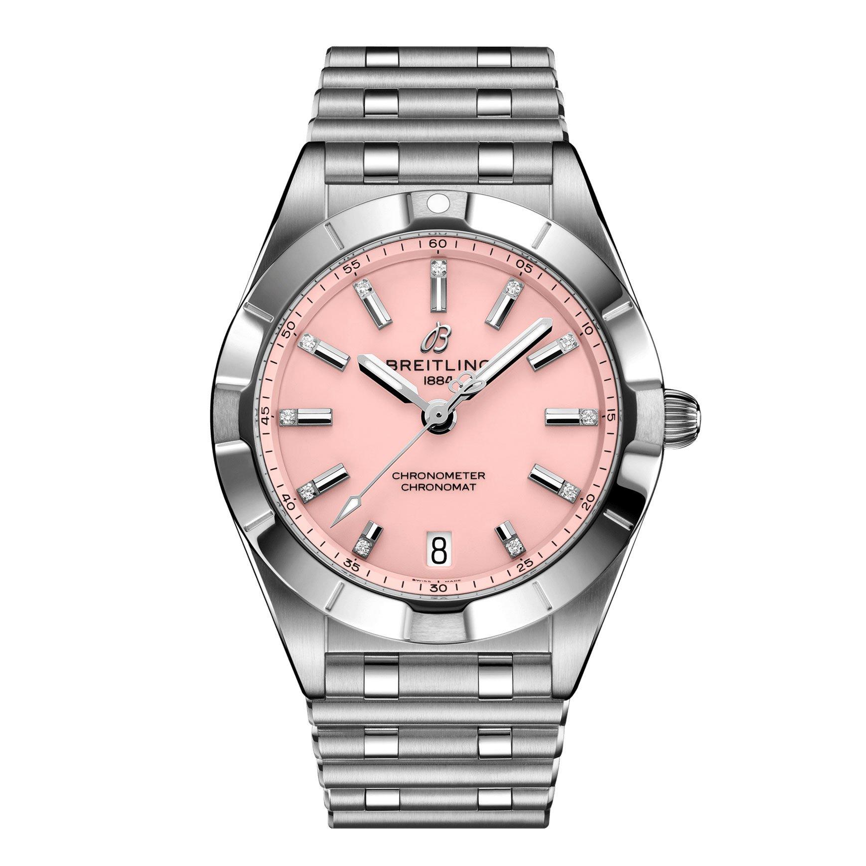 - Pink dial with date window positioned at 6 o’clock