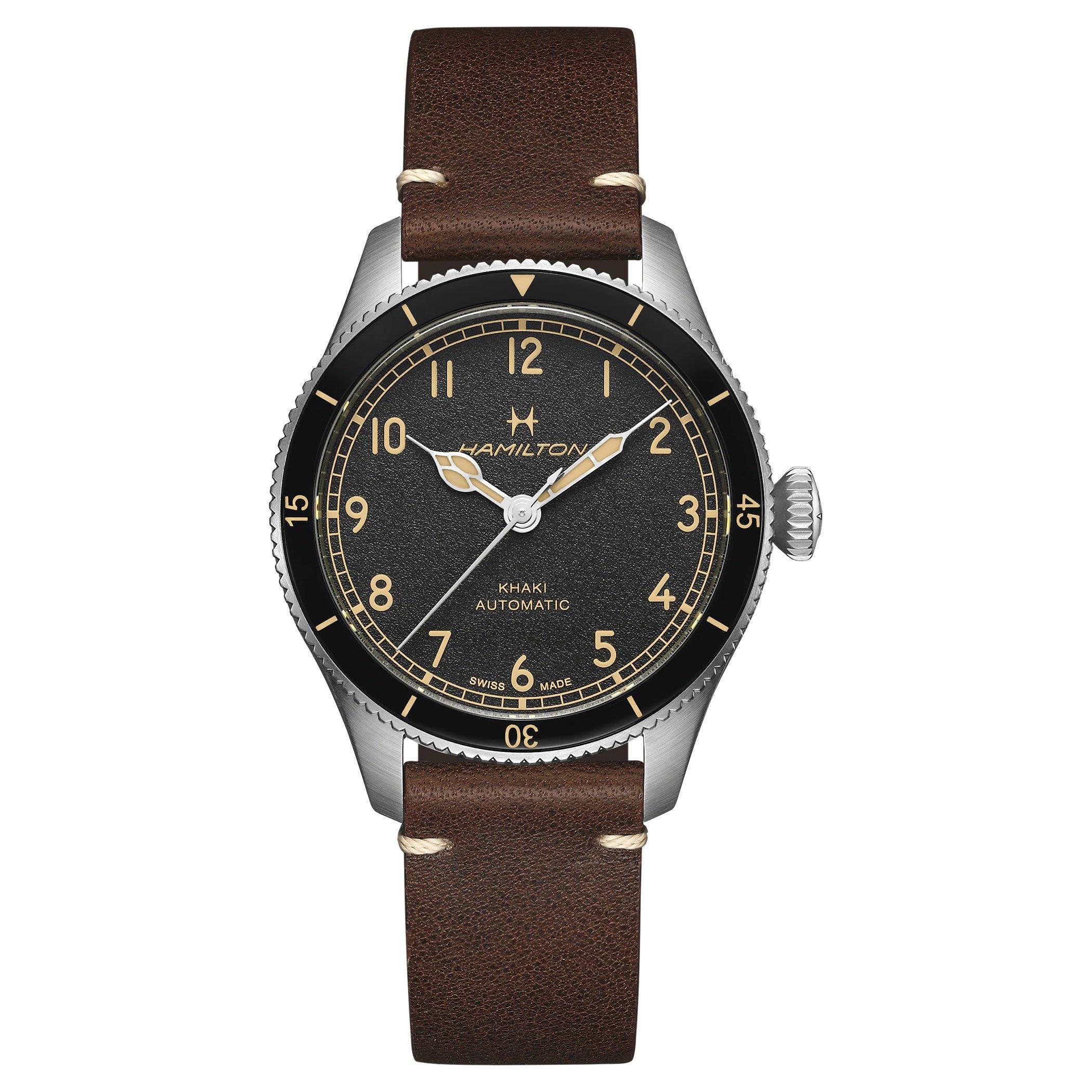 A sporty yet refined design, this Hamilton Khaki Aviation Pilot Pioneer is inspired by the Model 23, a cutting-edge pocket watch used by the US military during WWII. This timepiece is full of character, a distinctive aesthetic and ready to fly.