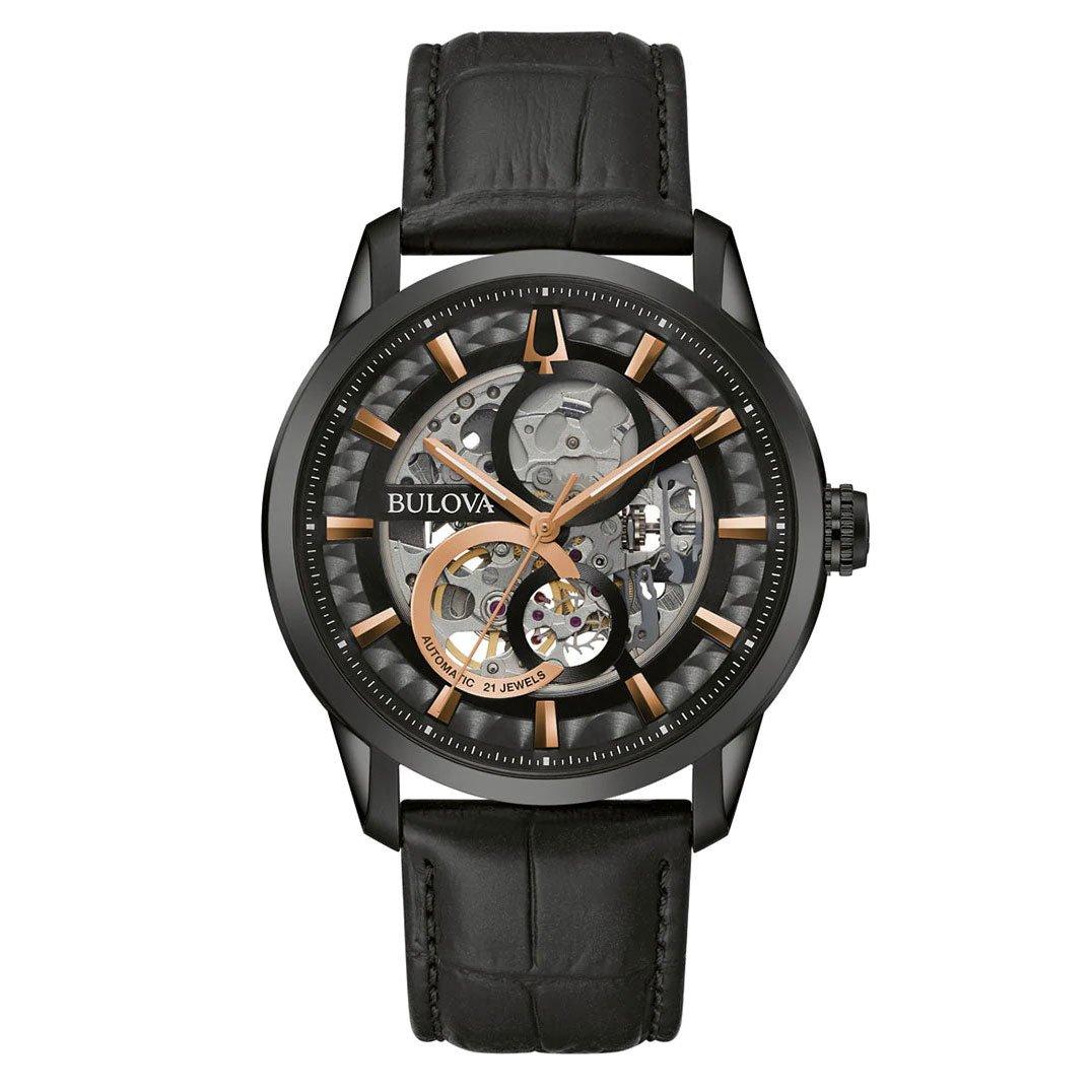 Putting a modern twist on a classic design, this Bulova Sutton Black Leather Automatic Men’s Watch is a striking and bold design that effortlessly blends together incredible craftsmanship with a contemporary aesthetic.