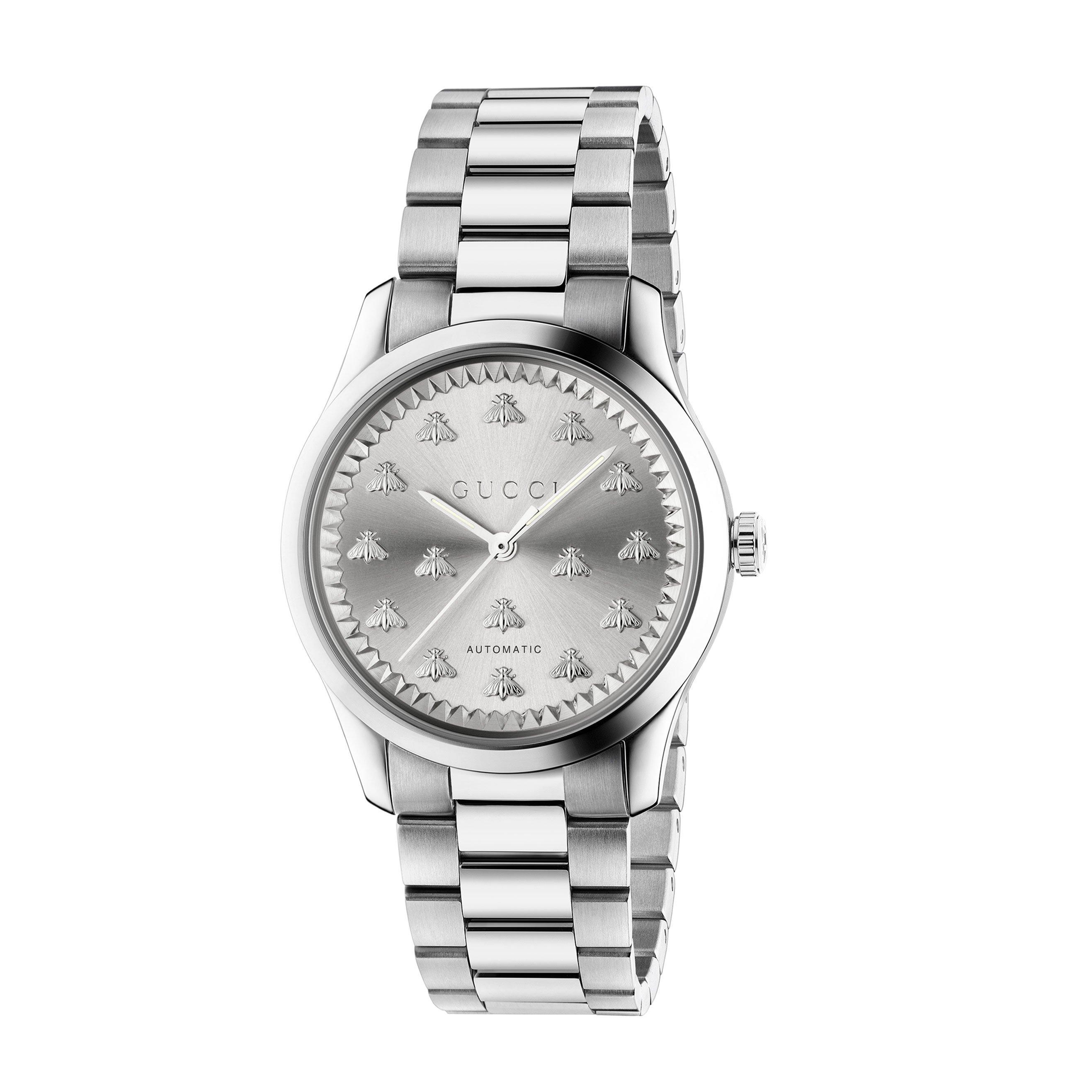 - Silver lacquered dial featuring Gucci bees with stainless steel hands