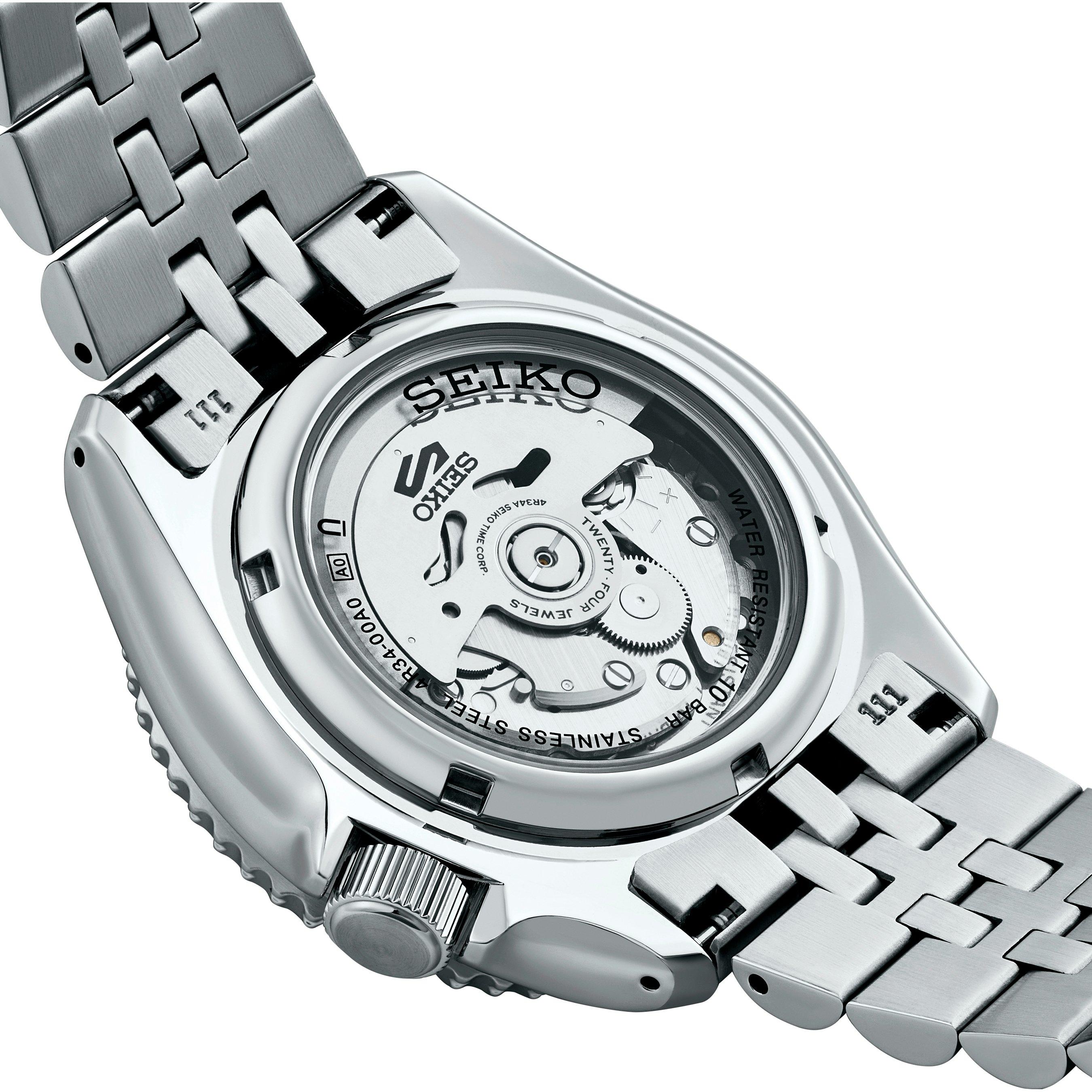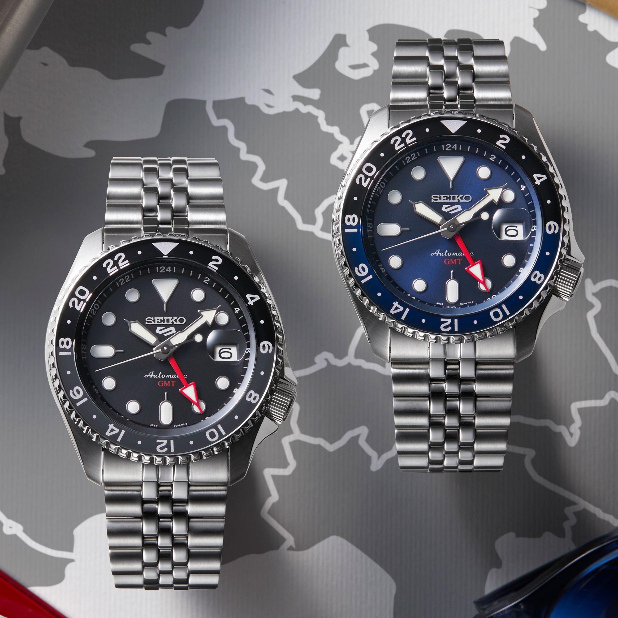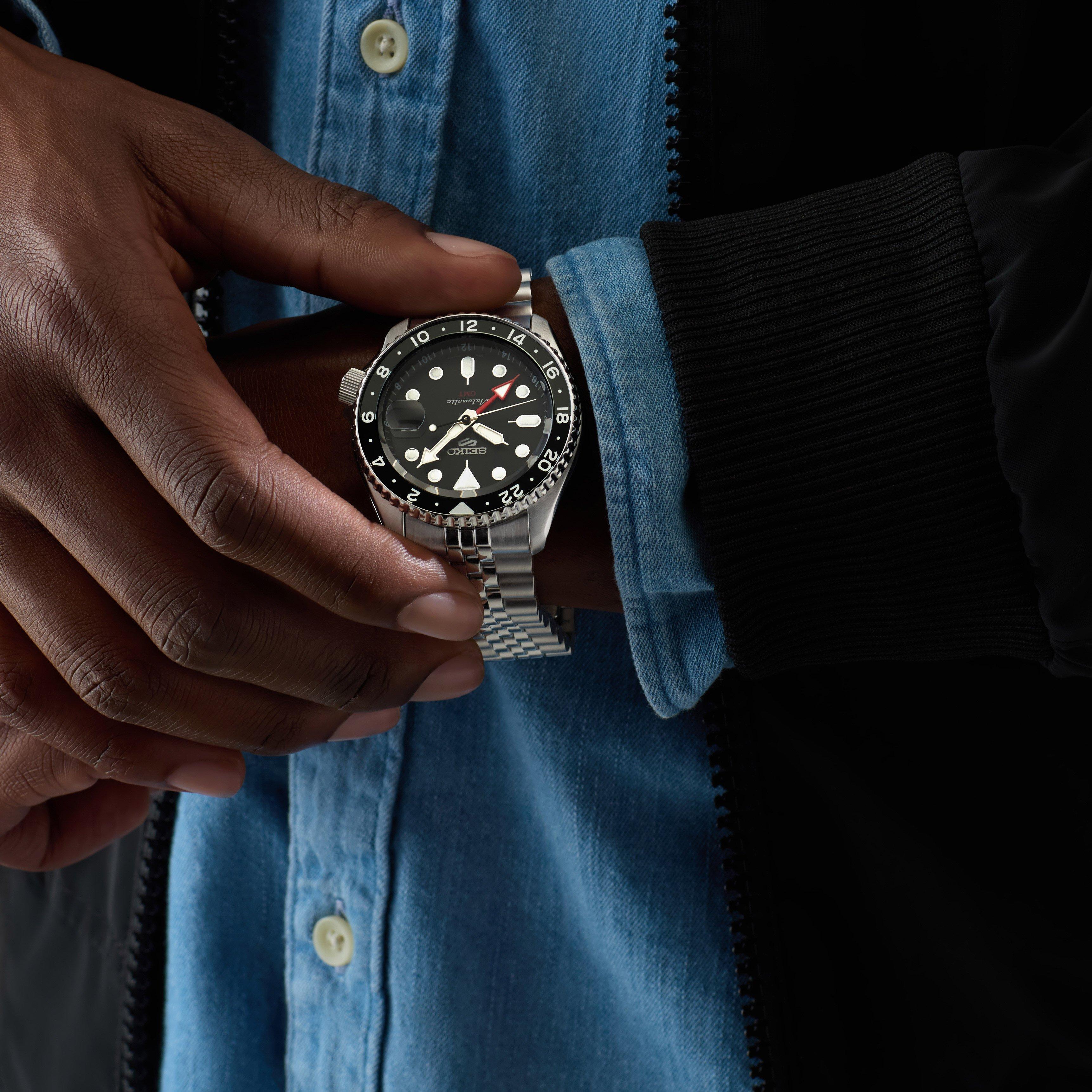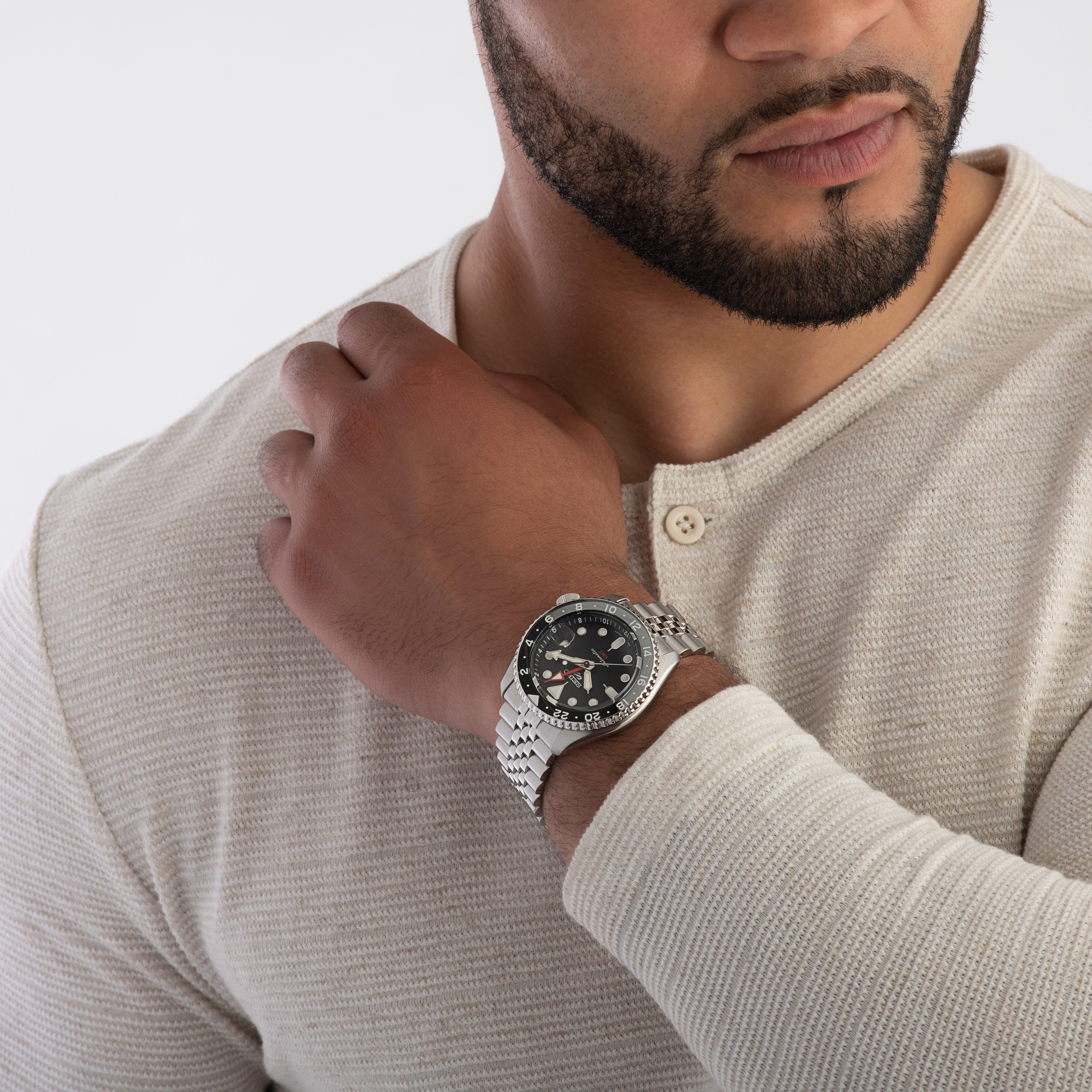 A modern revisiting of the Seiko SKX collection, this Seiko 5 Sports 'Black Grape' GMT SKX Re-interpretation 42.5mm Men’s Watch offers practicality and versatility with a hardened crystal and 24-hour hand.