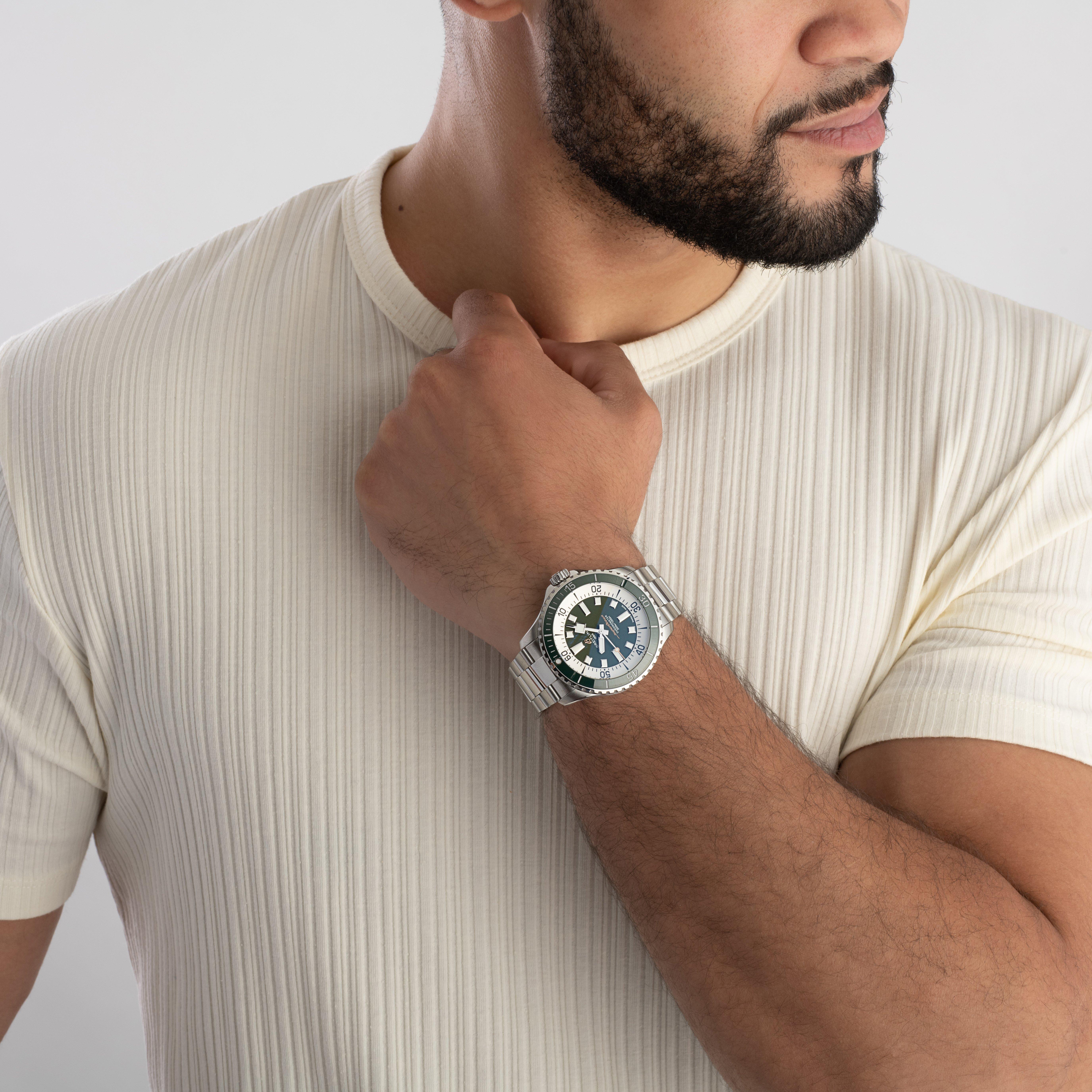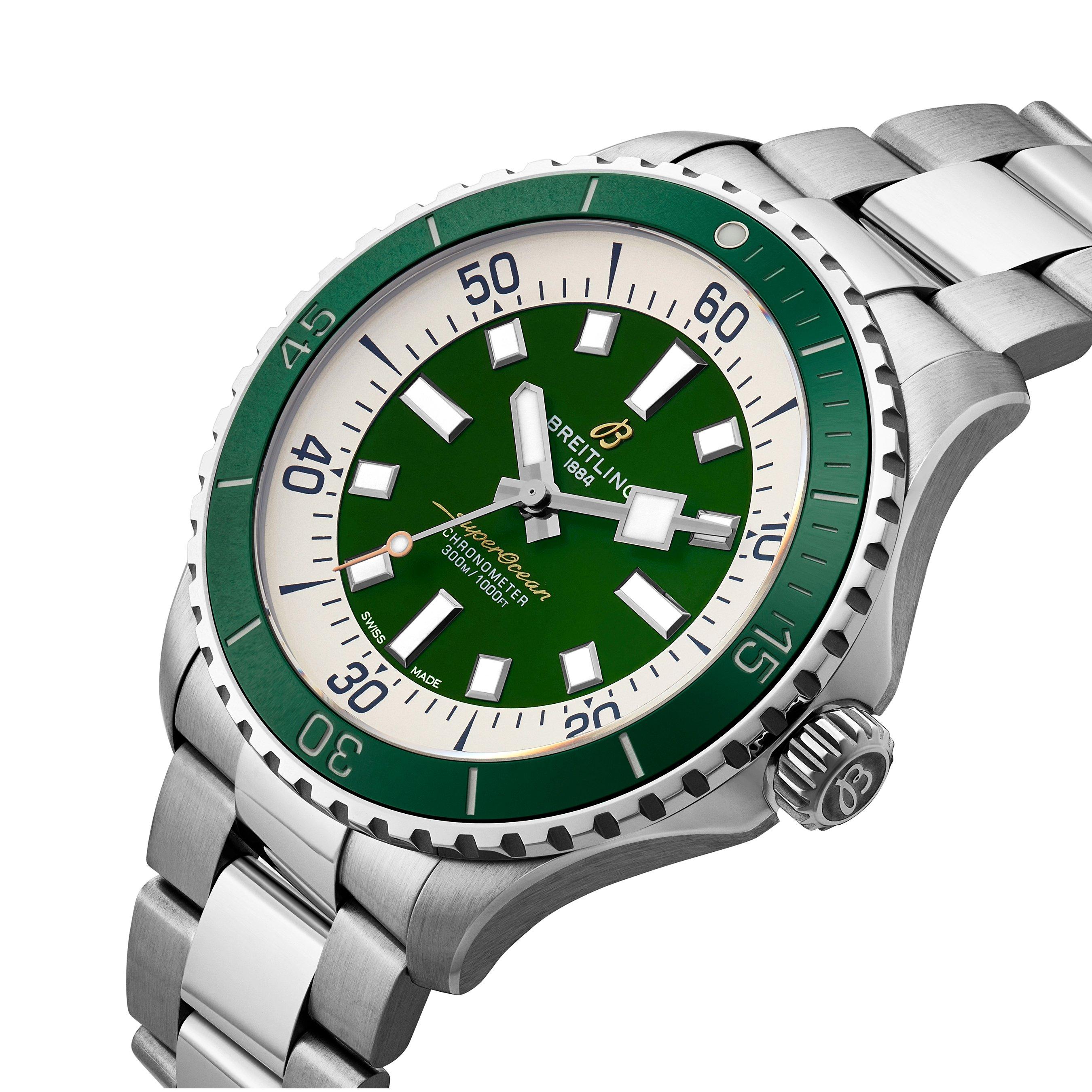 - Green dial with baton markers and hands coated in luminescent Super-LumiNova