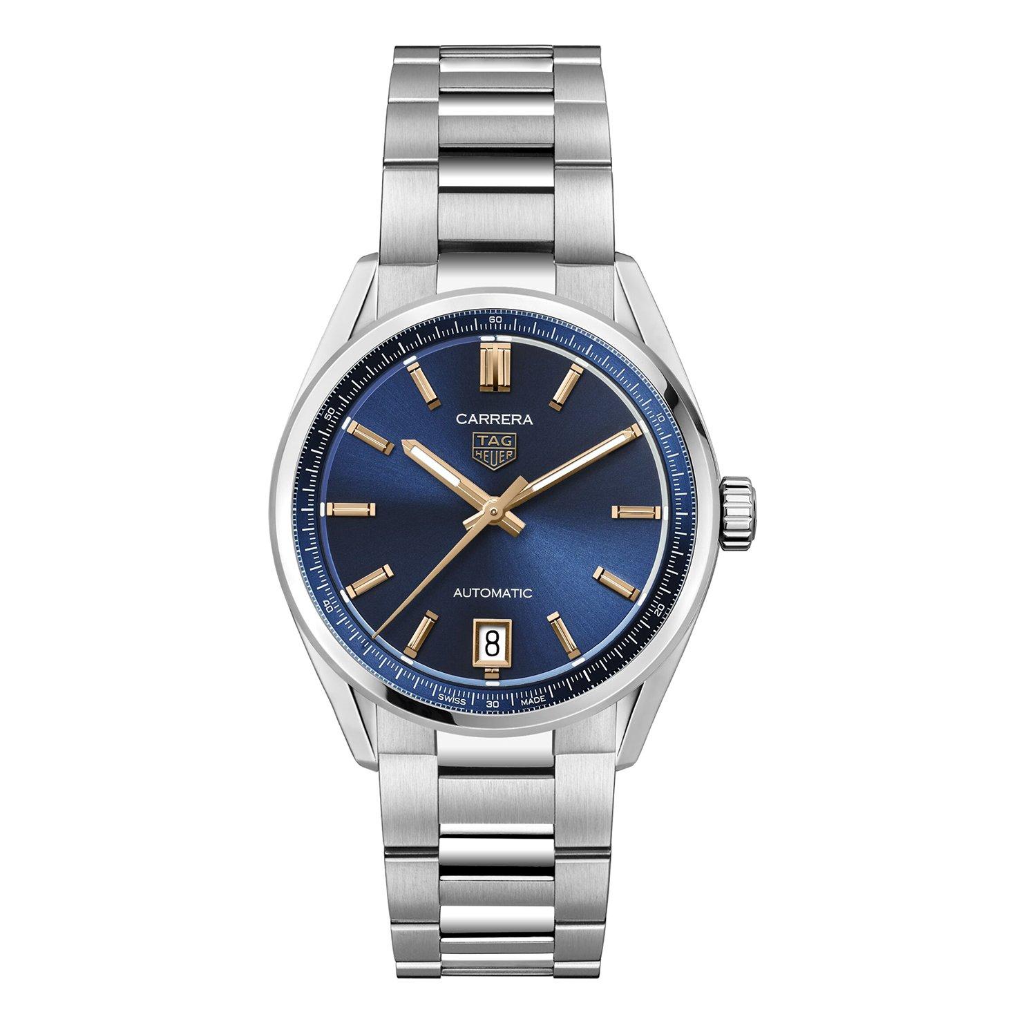 Chic and confident, this TAG Heuer Carrera 36mm Automatic Watch delivers elegance in every detail. Showcasing a striking deep-blue sunray brushed dial, enhanced with 18k 5N rose gold-plated hands and indexes, this timepiece is a superior blend of style and function.