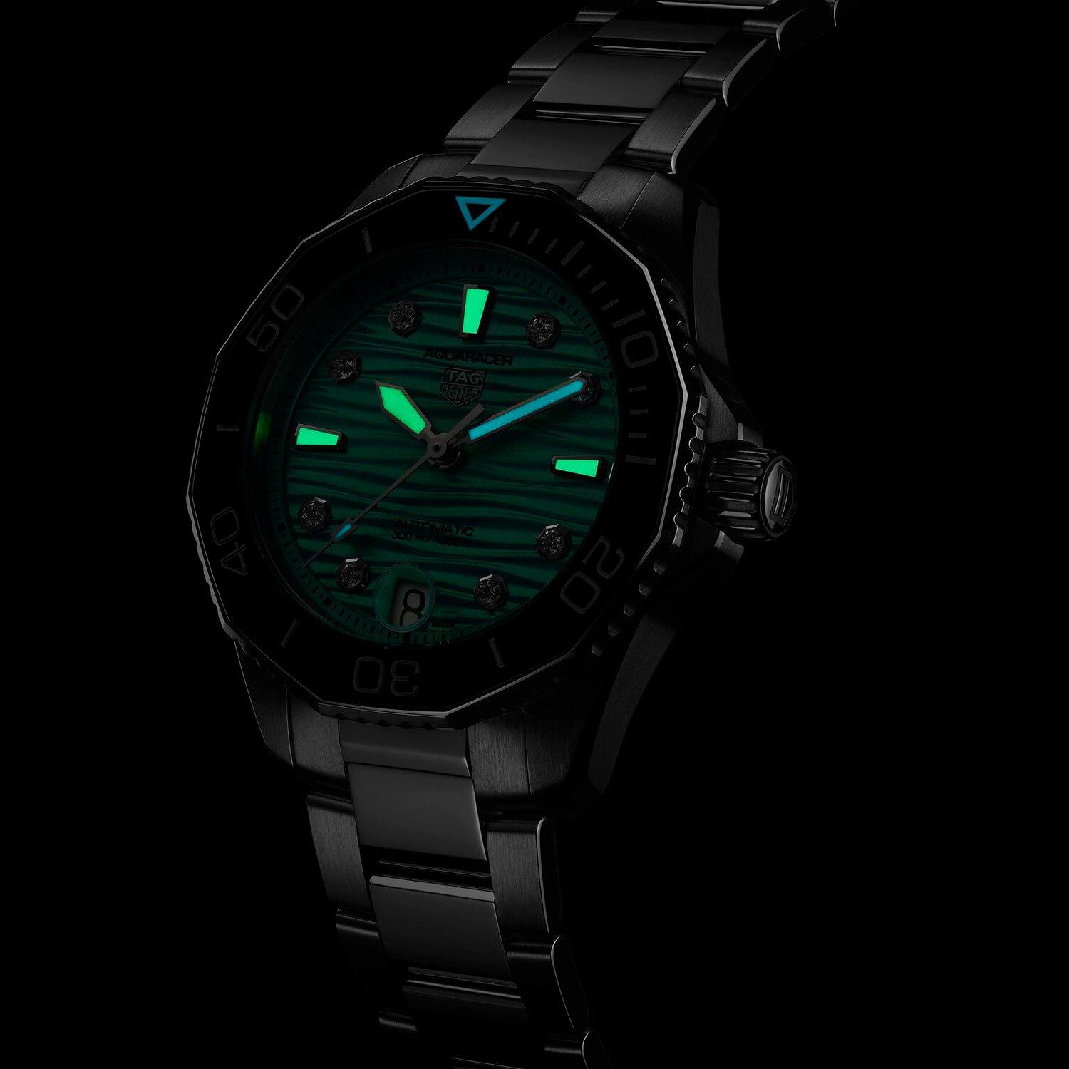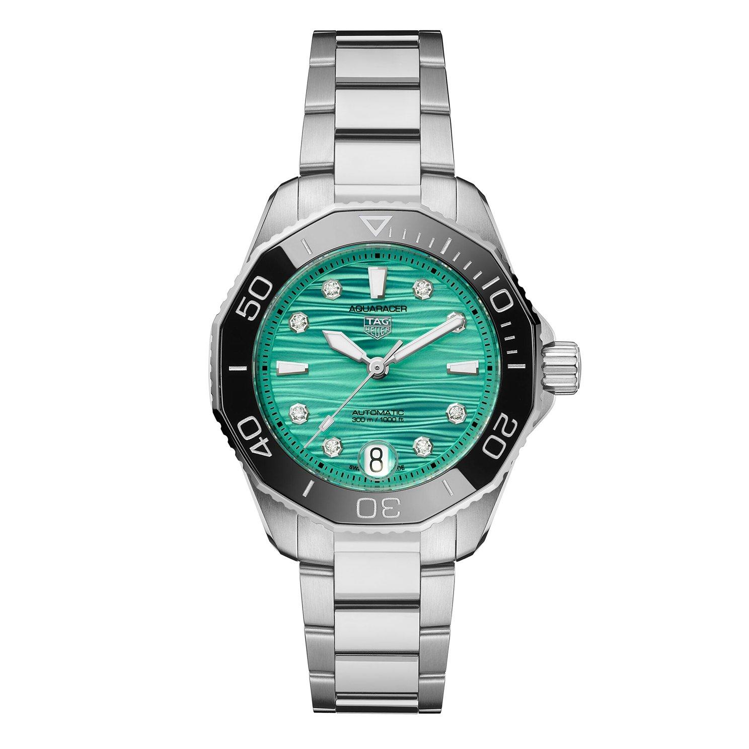 Inspired by idyllic lagoons, this TAG Heuer Aquaracer Professional 300 36mm Diamond Automatic Ladies Watch showcases a bold turquoise dial with a distinctive wave pattern paying tribute to warm waters. Adorning diamond detailing, this luxurious aesthetic is combined with excellent functionality. Crafted for great depths, this timepiece is ready to push boundaries.