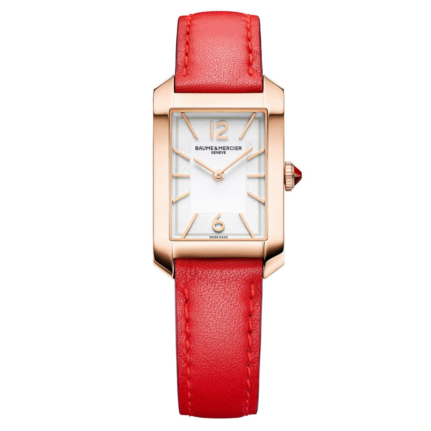 Offering a streamlined look, echoing the original, this Baume & Mercier Hampton 18ct Rose Gold Leather Ladies Watch boasts a classic timepiece with a contemporary twist. Showcasing an 18ct rose gold titanium design enhanced with an orange calfskin leather strap, this Baume & Mercier Hampton 35mm 18ct Rose Gold Titanium Ladies Watch effortlessly combines a chic aesthetic with the luxury of Swiss watchmaking.