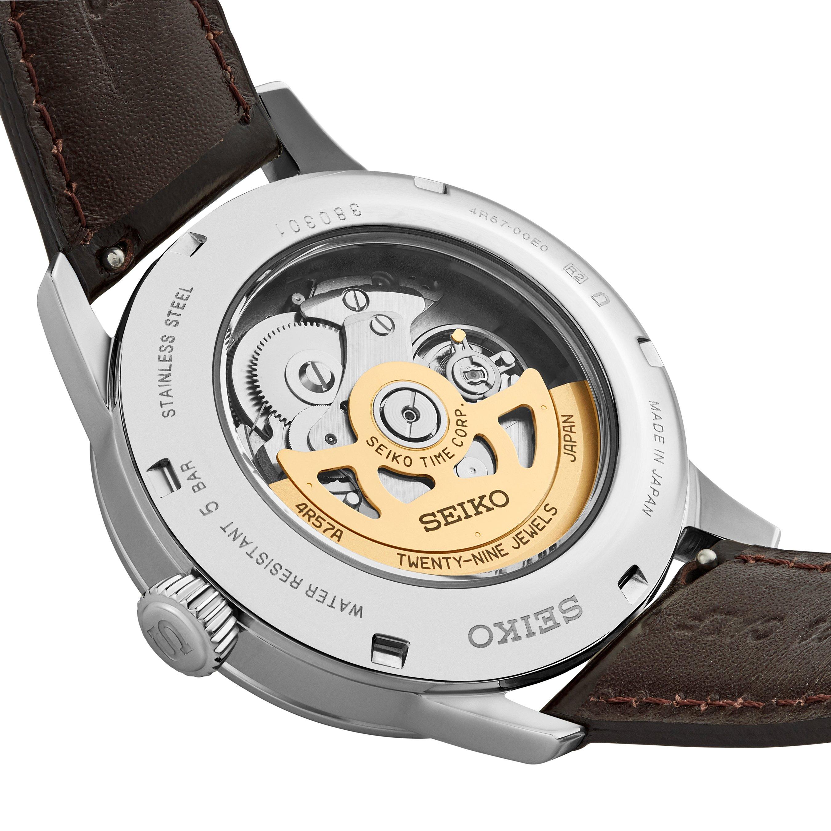 - Powered by an automatic with manual winding movement