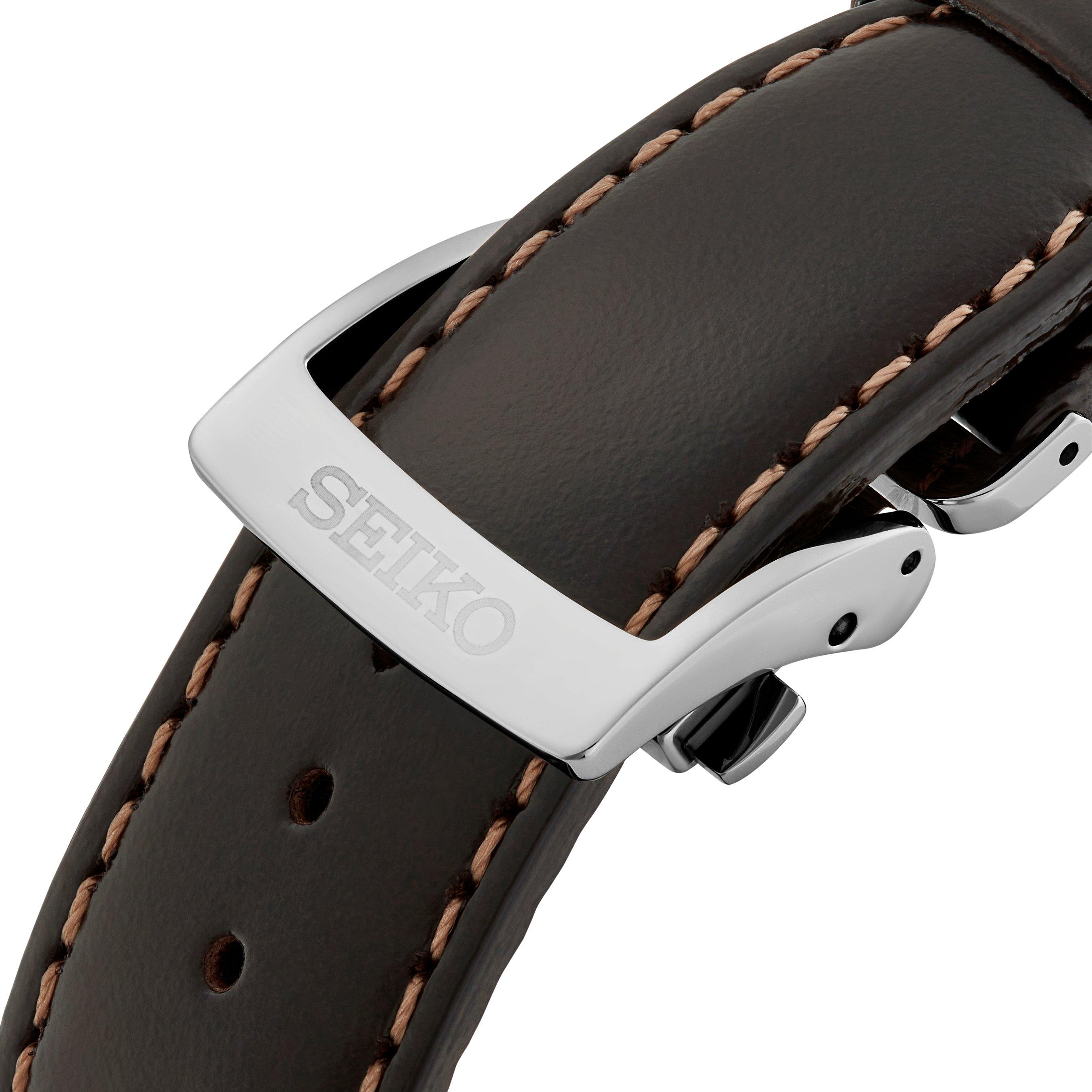 - Presented on a calfskin leather strap and finished with a three-fold clasp with push button release