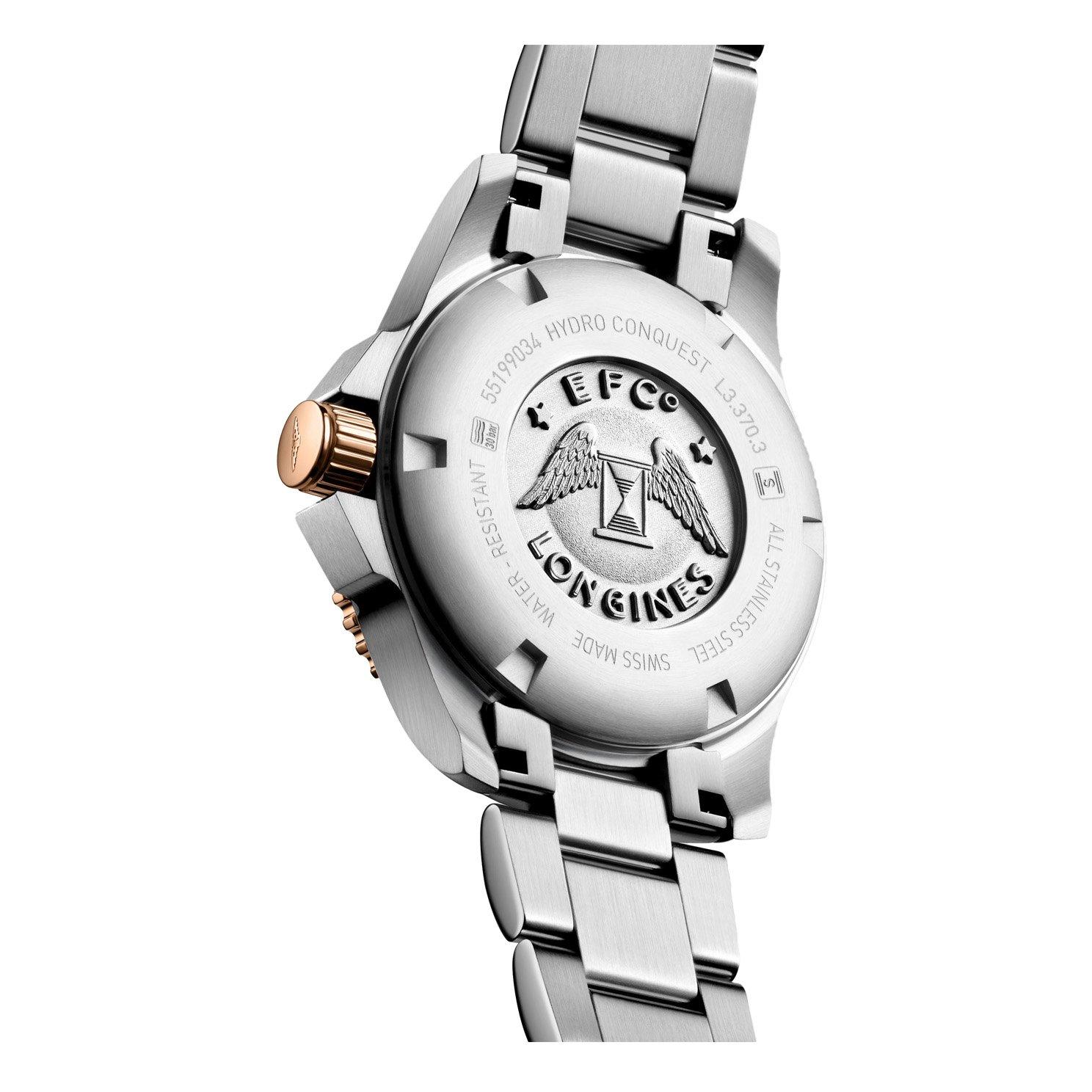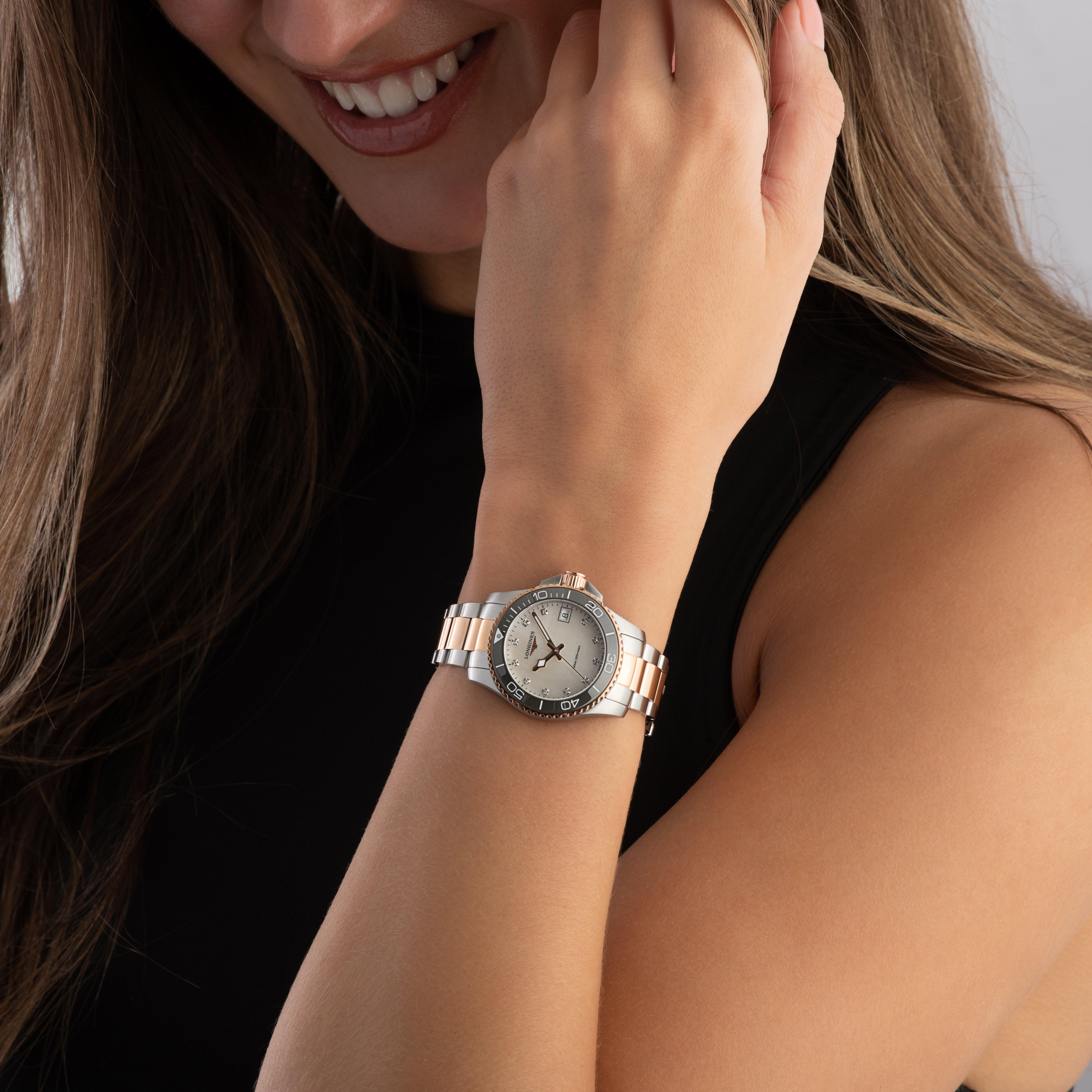 Make an entrance with this Longines HydroConquest 32mm Stainless Steel and Rose Gold PVD Diamond Ladies Watch. Adorned with exquisite design details, the rose gold complements this stainless steel silhouette beautifully.