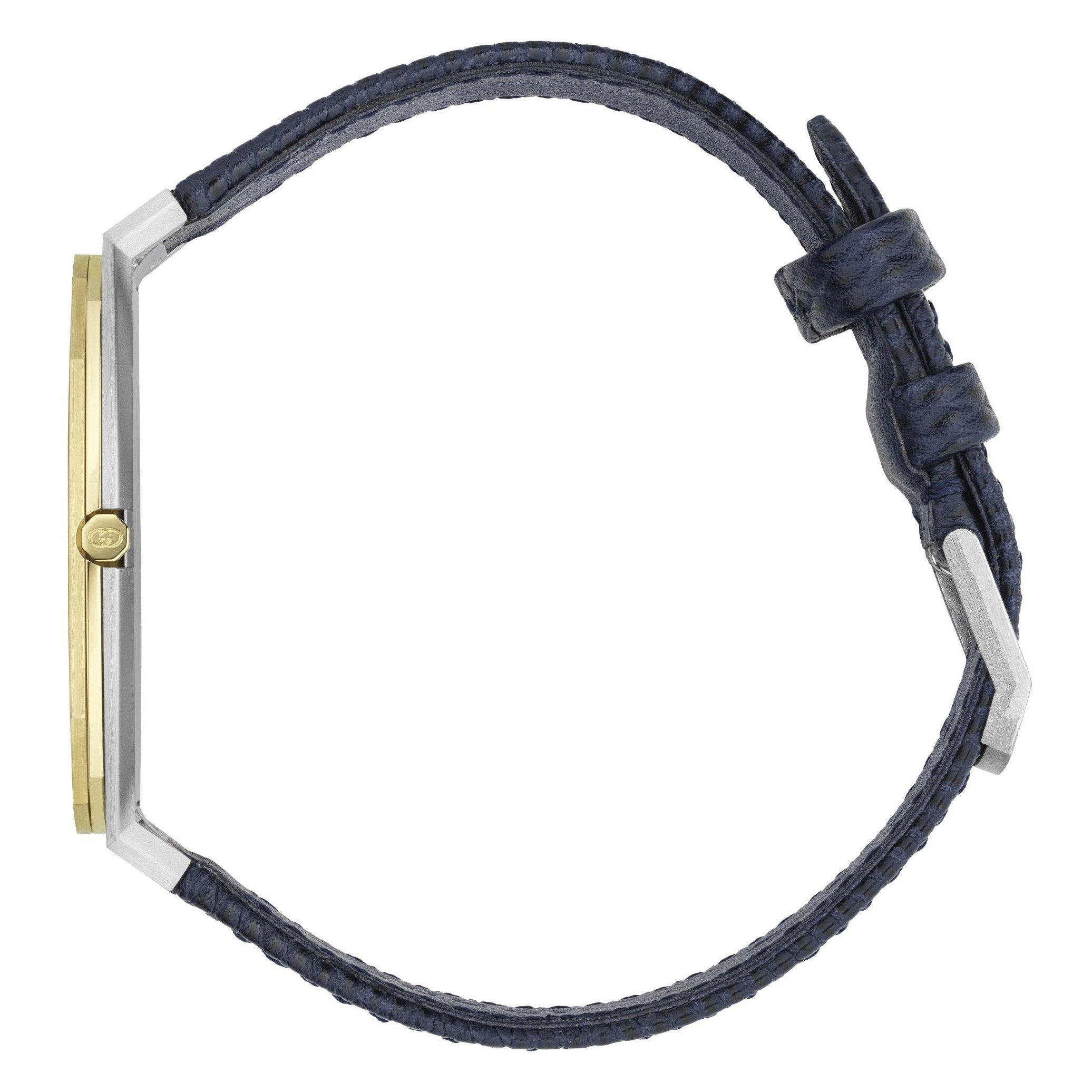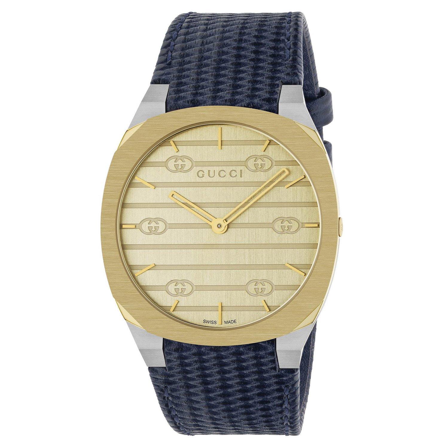 Boasting a streamlined silhouette, this Gucci 25H 38mm 18ct Yellow Gold Watch is inspired by the sleek forms of contemporary architecture. Designed with an 18ct gold plated multi layered case, golden brass dial and blue leather strap, this timepiece is both versatile and stylish.
