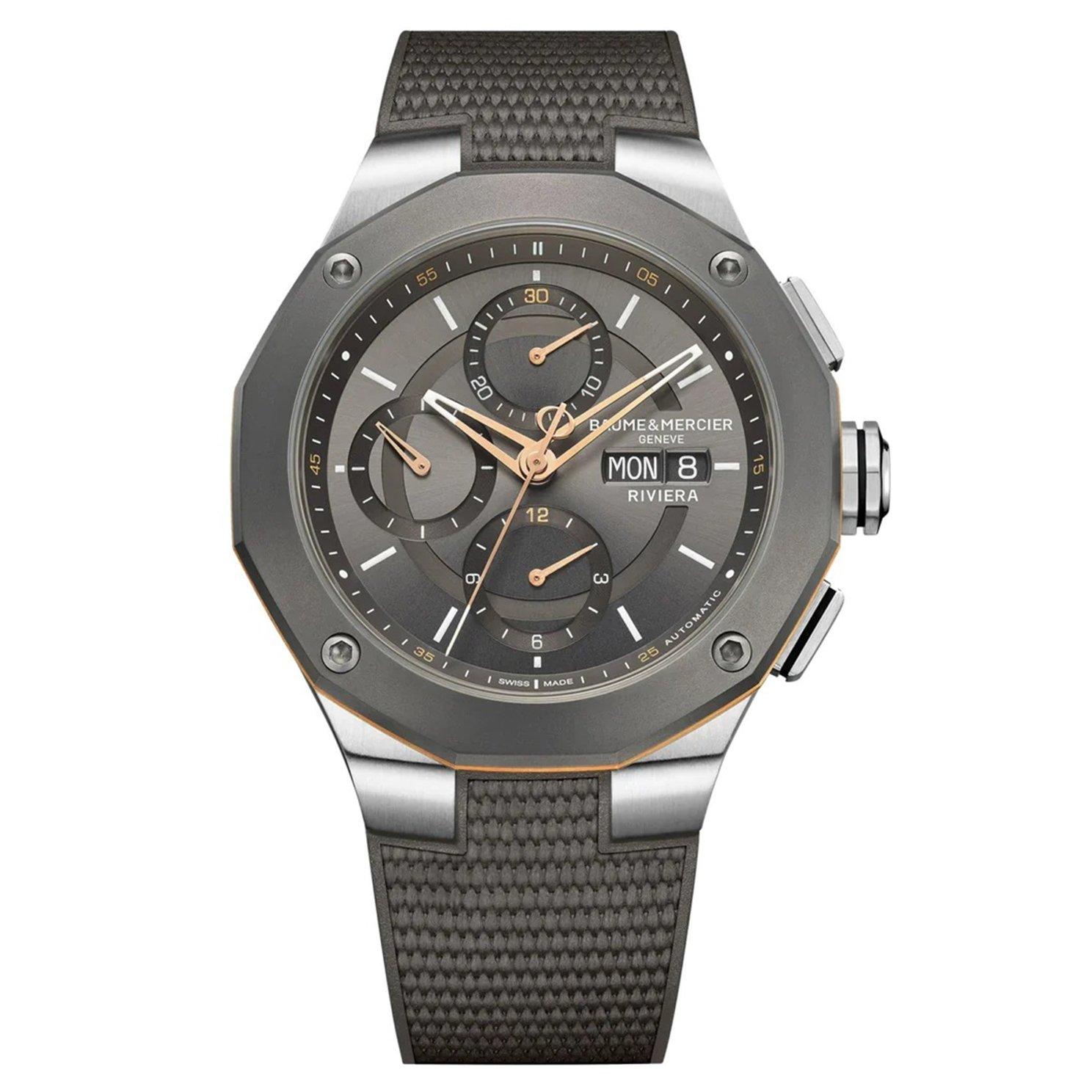Ensuring excellence in every detail, this Baume & Mercier Riviera 43mm Chronograph Automatic Men’s Watch expresses the brands expertise in design and use of materials. Admire the Baumatic manufacture movement through the smoked sapphire dial in this bold and confident design.