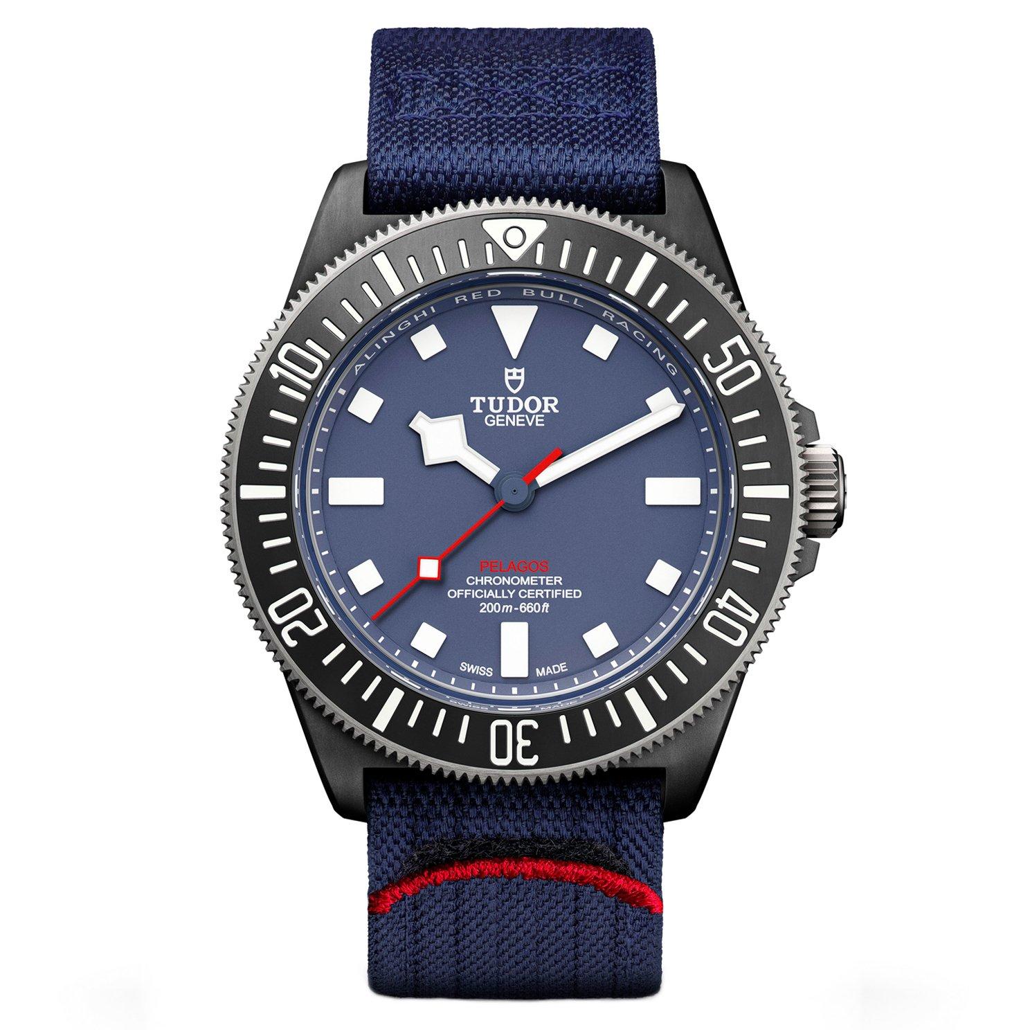 - Presented on a single-piece blue fabric strap with red accents and finished with a titanium D buckle with a self-gripping fastening system, adapting to different wrist sizes and is very comfortable to wear