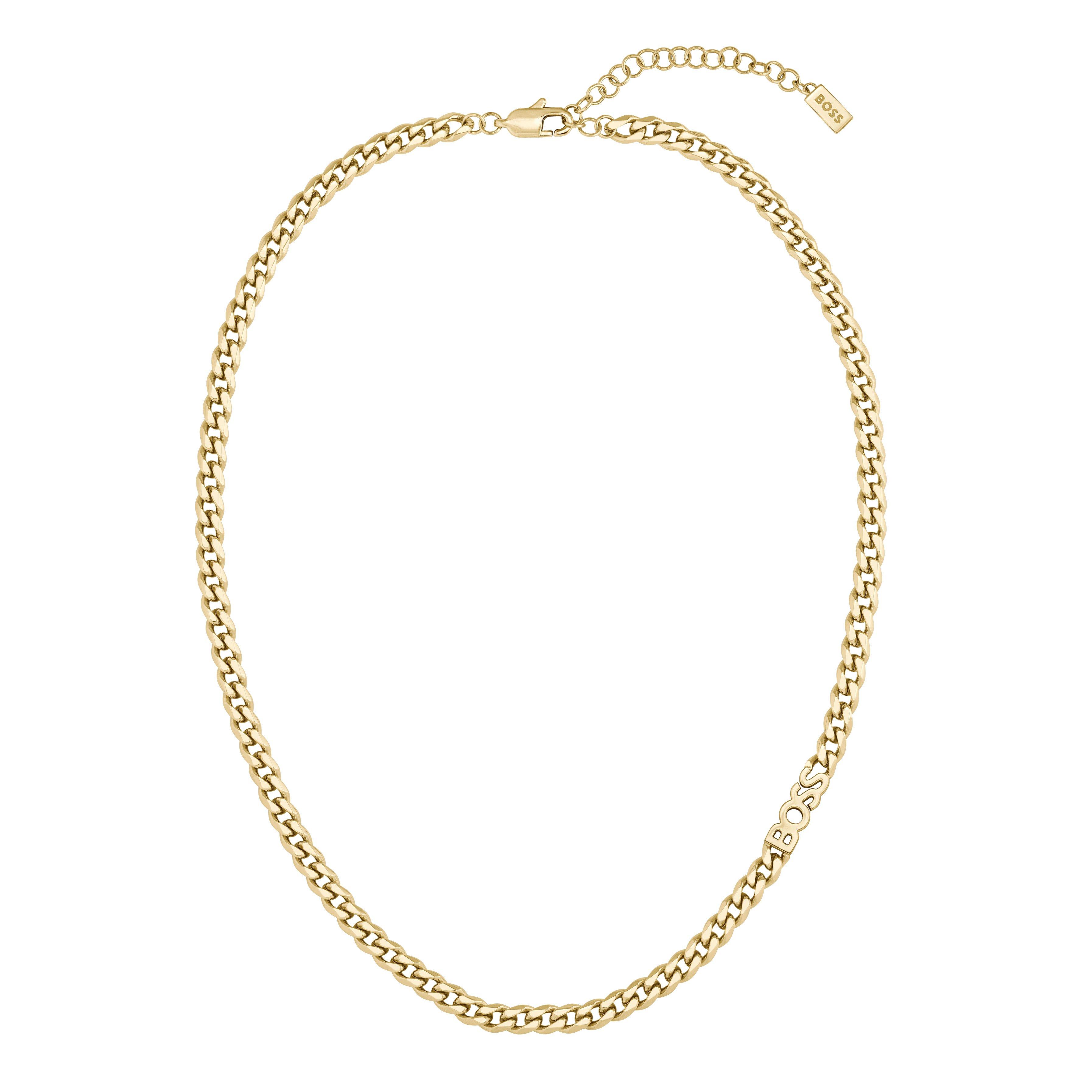 Adorned with instantly recognisable details, create a stylish look with this BOSS Kassy Yellow Gold Plated Necklace. Symbolising iconic style, this luxurious piece is crafted to captivate.
