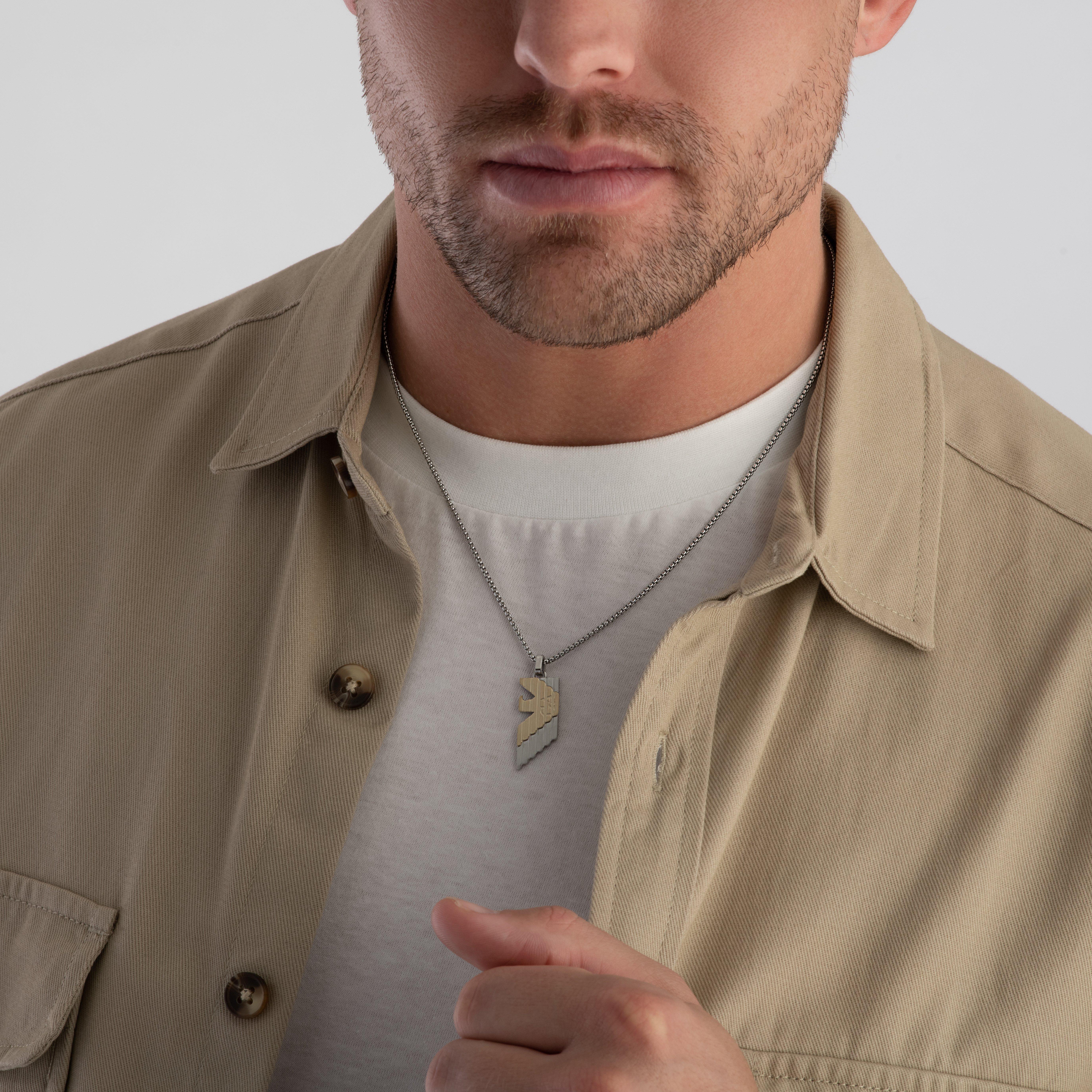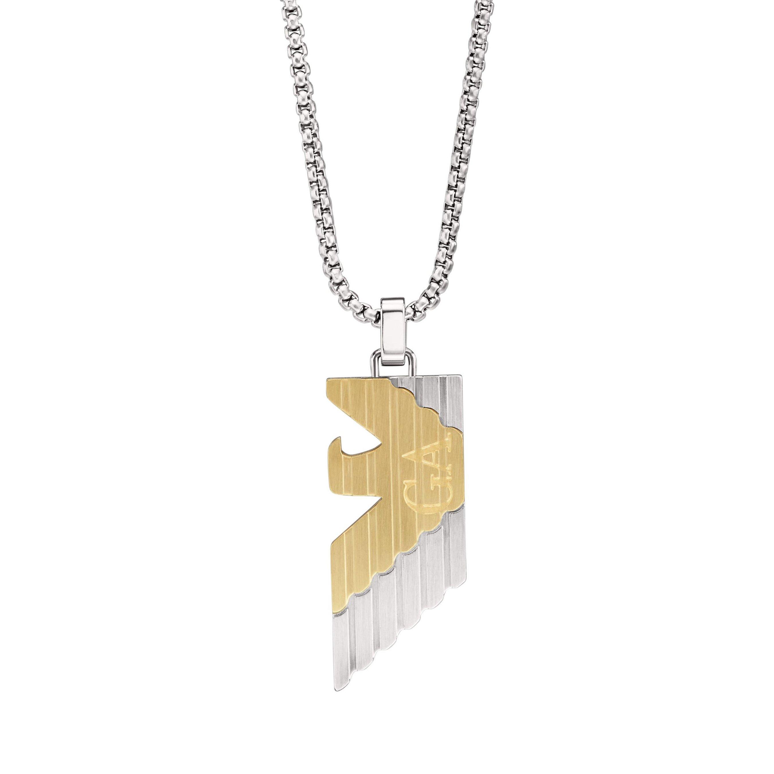 Elevate your style with this Emporio Armani Stainless Steel and Gold Tone Pendant, a blend of timeless elegance and modern flair. Featuring a sleek two-tone design that effortlessly complements any ensemble, whether worn as a statement piece or layered with other accessories, it’s sure to make a lasting impression.