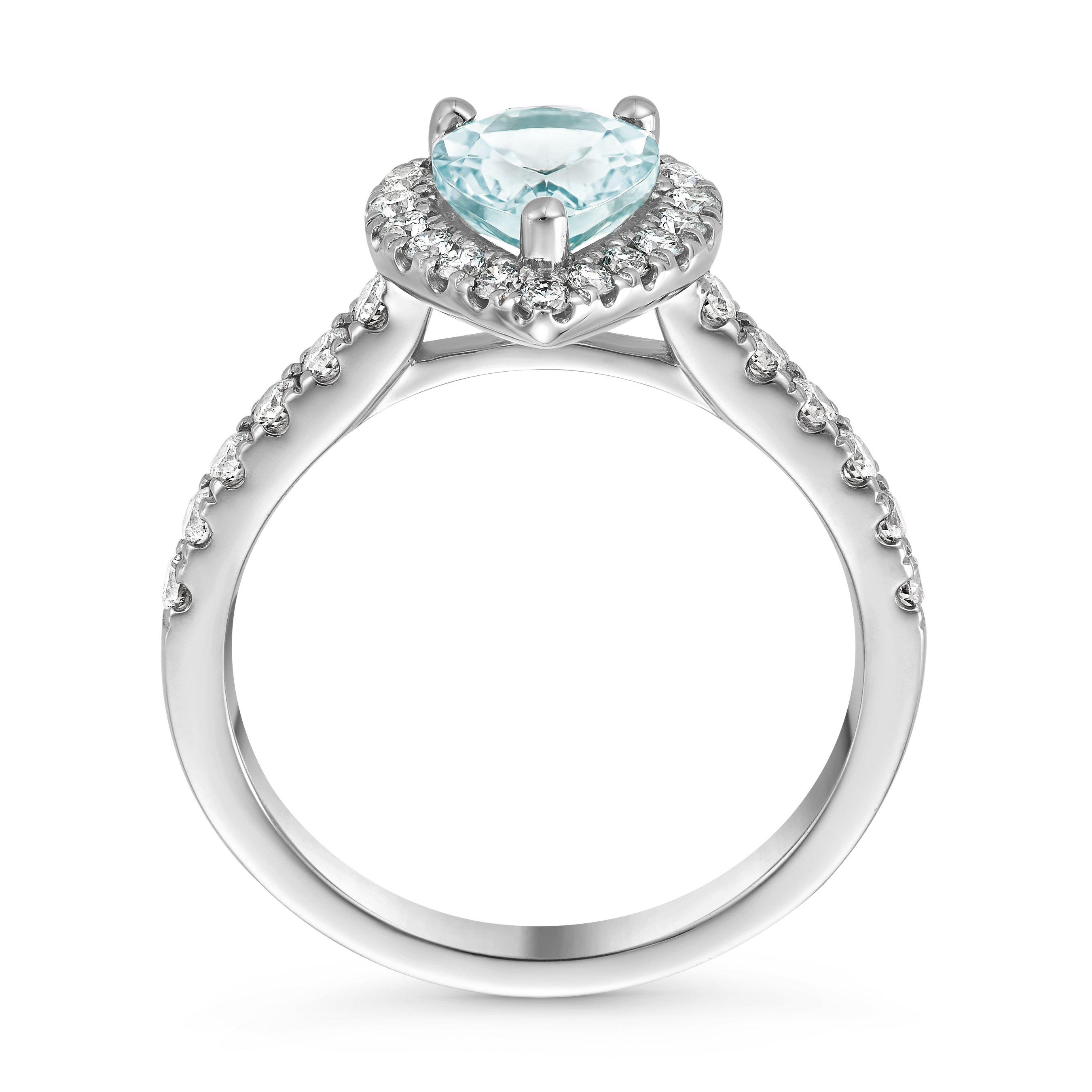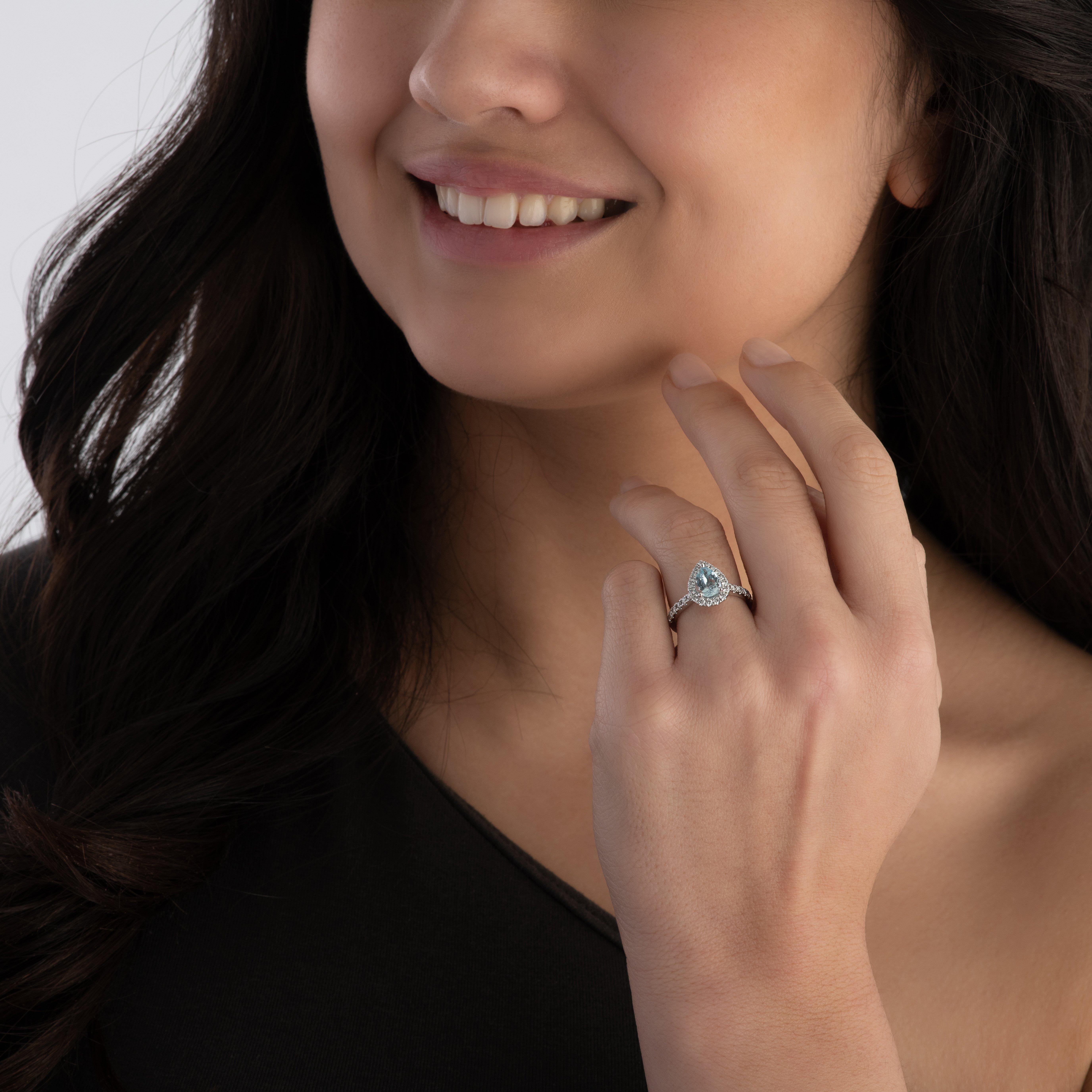 Give them a gift they will never forget with this stuning Platinum Diamond Aquamarine Halo Engagement Ring. Taking centre stage is a charming aquamrine stone that radiates stunning blue hues and is effortlessly characterised by the fire and brilliance of the diamonds that accompany it.