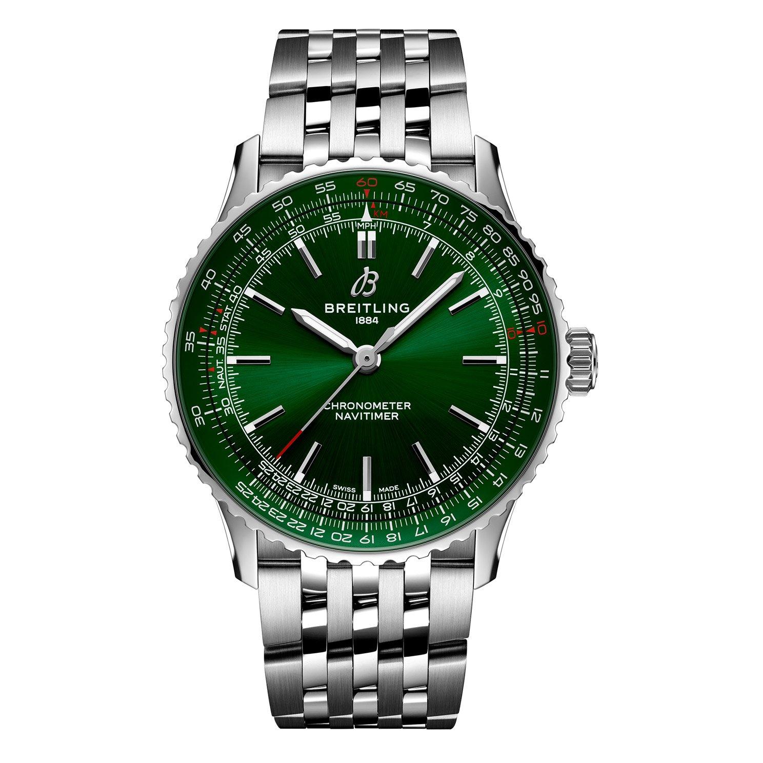 - Green dial with stainless steel hands and hour markers and the B-Breitling-1884 corporate logo displayed at 12 o’clock
