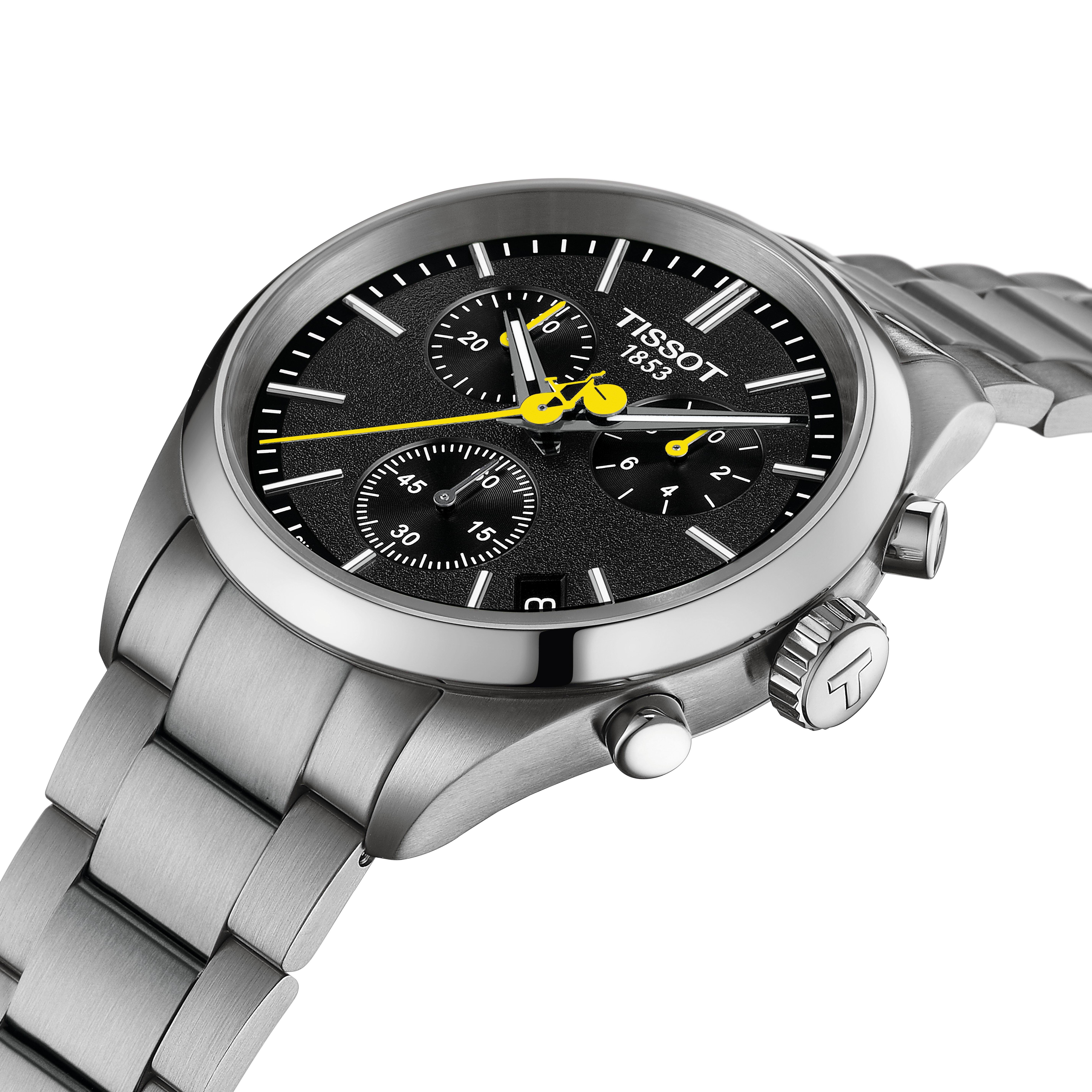 - Black dial with stainless steel hands, a bicycle-shaped second hand featuring the iconic yellow colour of the competition and hour markers with Super-LumiNova®