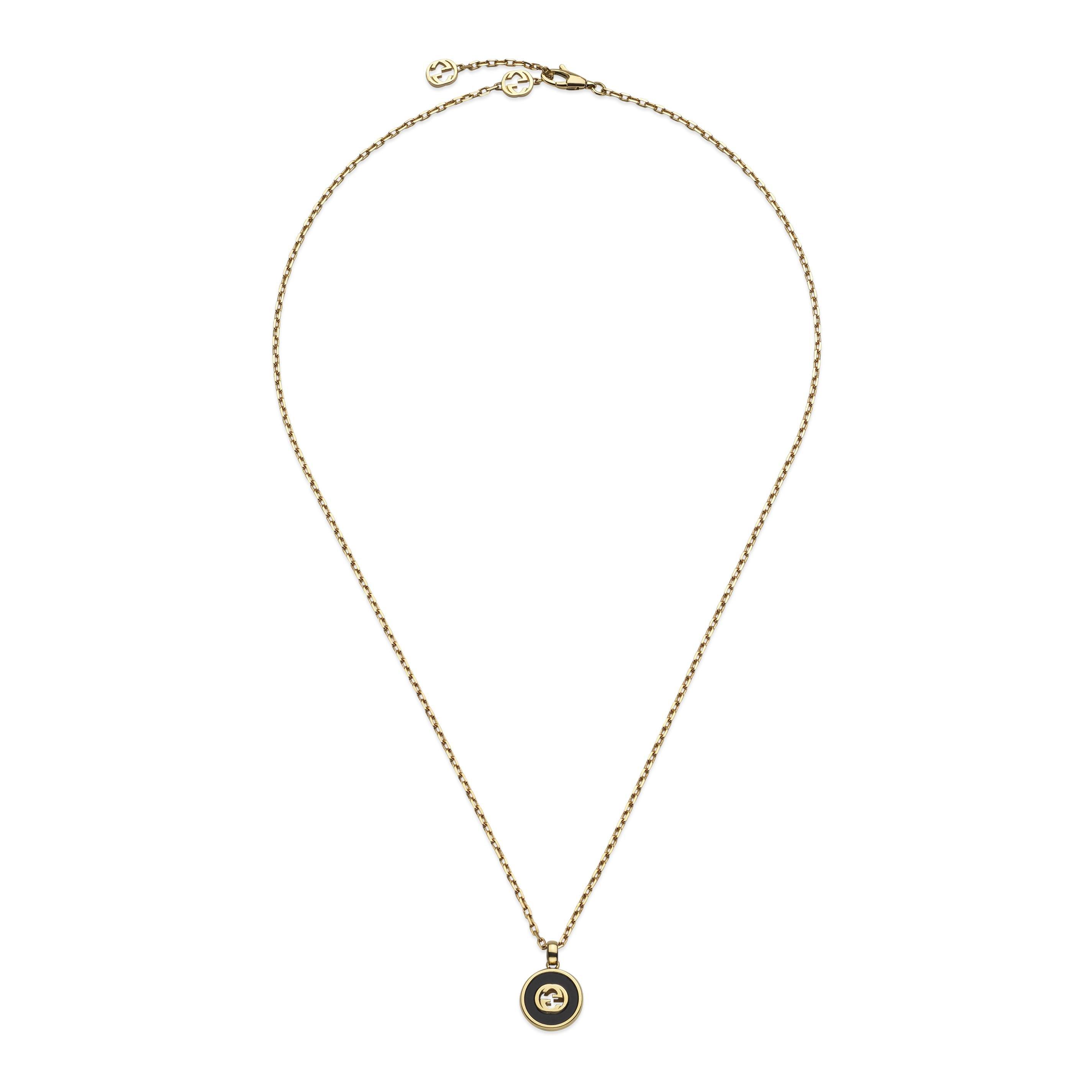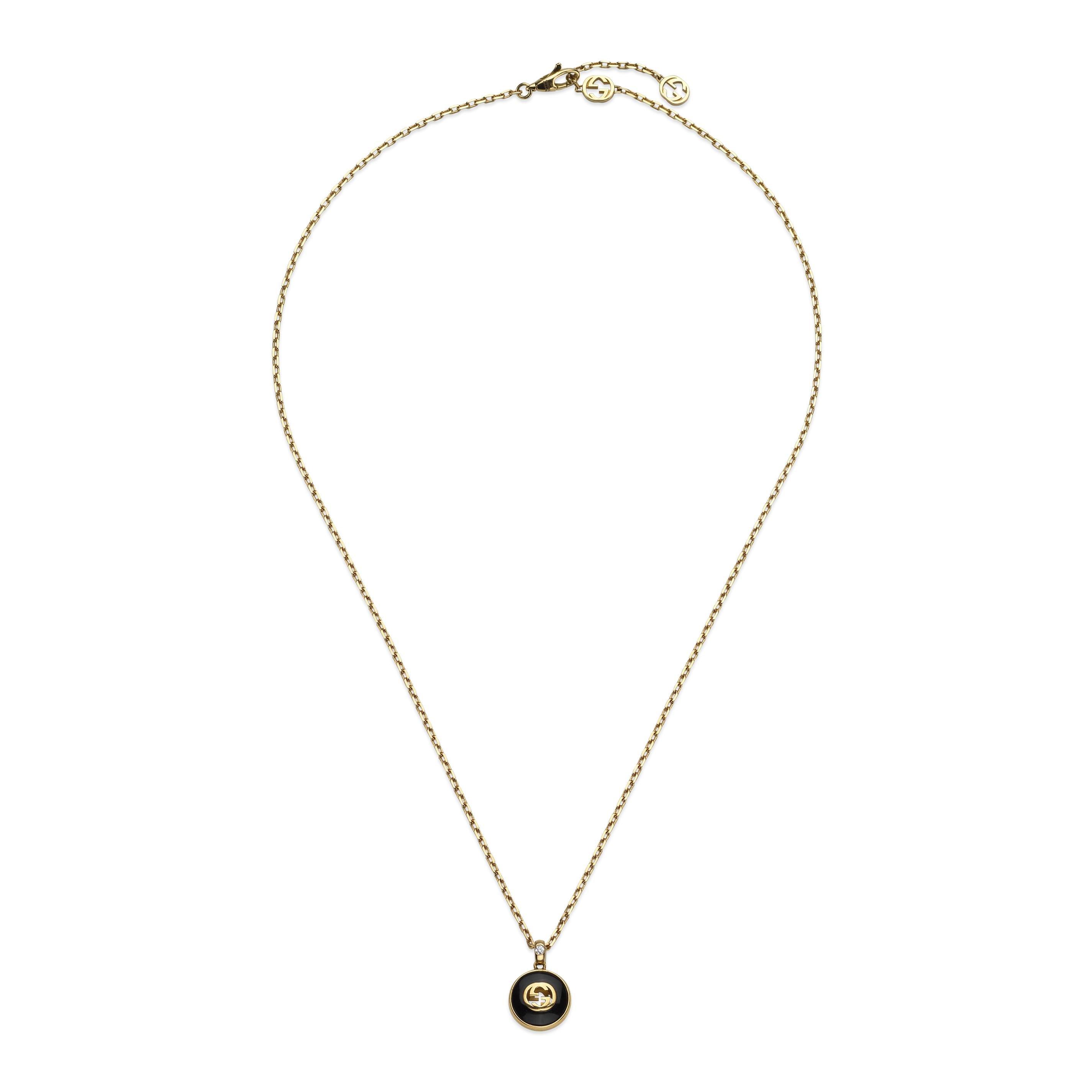 Complete your look with the epitome of luxury and sophistication with this Gucci Interlocking 18ct Yellow Gold Diamond Onyx Necklace. Radiating timeless elegance and the brands rich heritage, this captivating design captures the essence of luxury in every detail.
