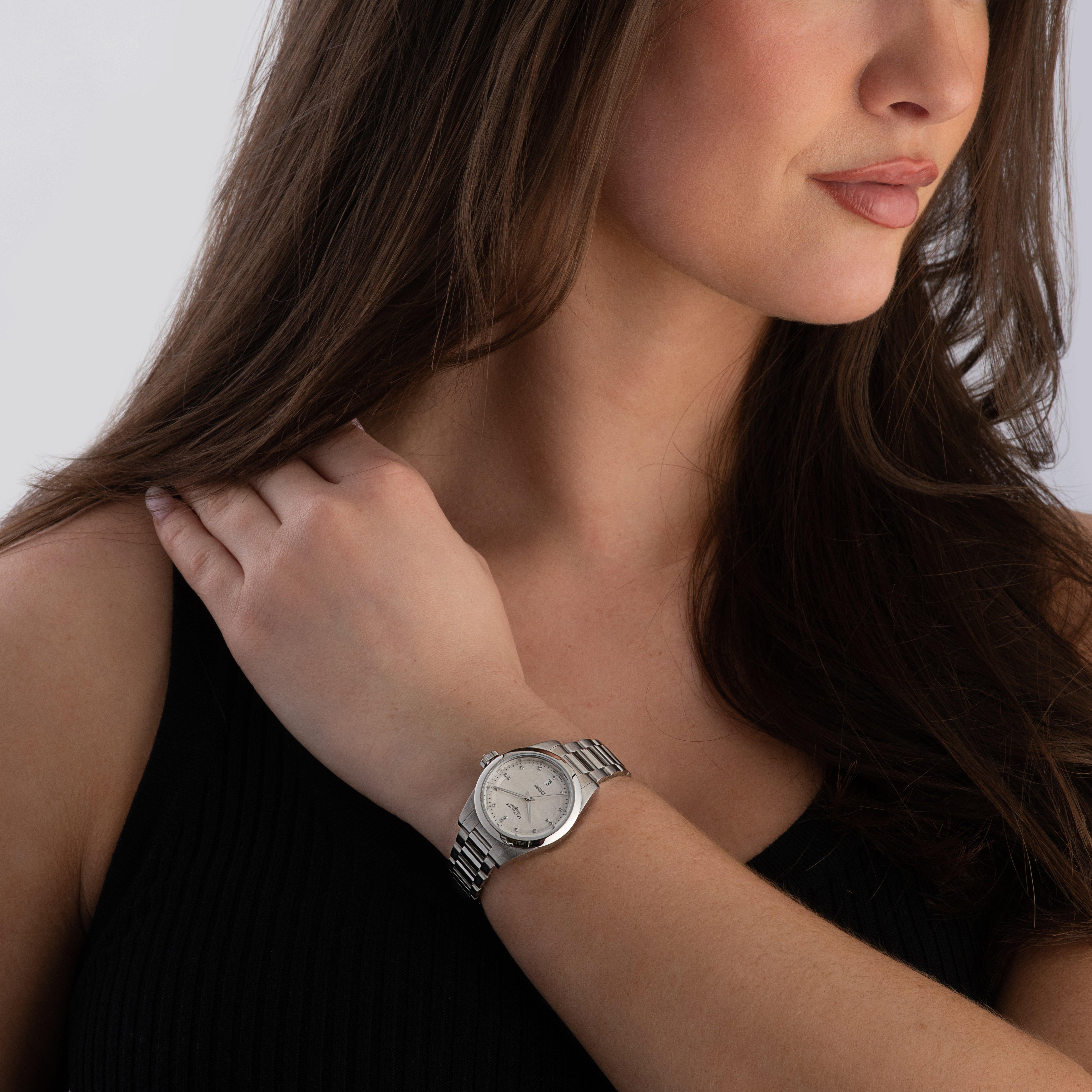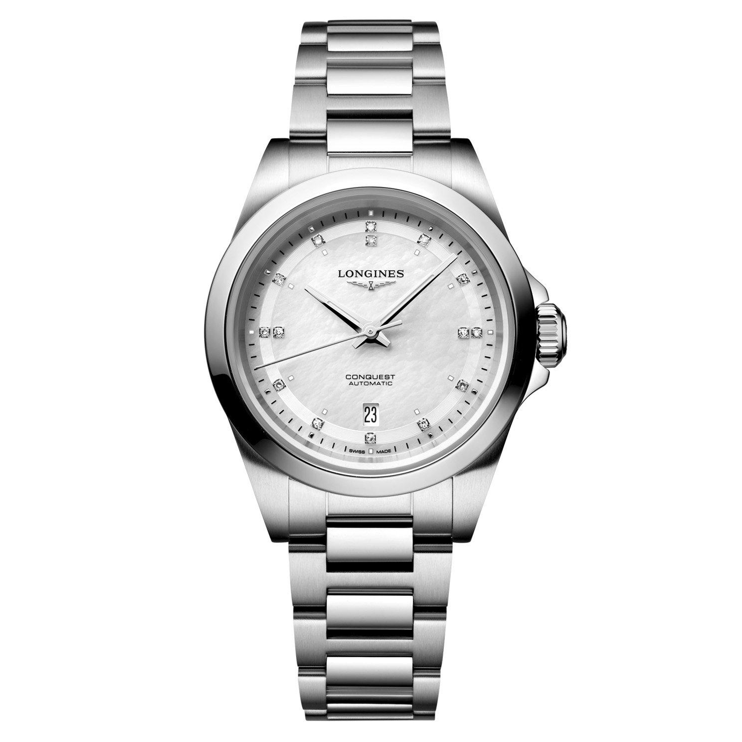 Experience the allure of luxury with this Longines Conquest 30mm Diamond Mother of Pearl Automatic Ladies Watch. A symbol of timeless elegance and refinement, elevate your timepiece collection with this enchanting design.