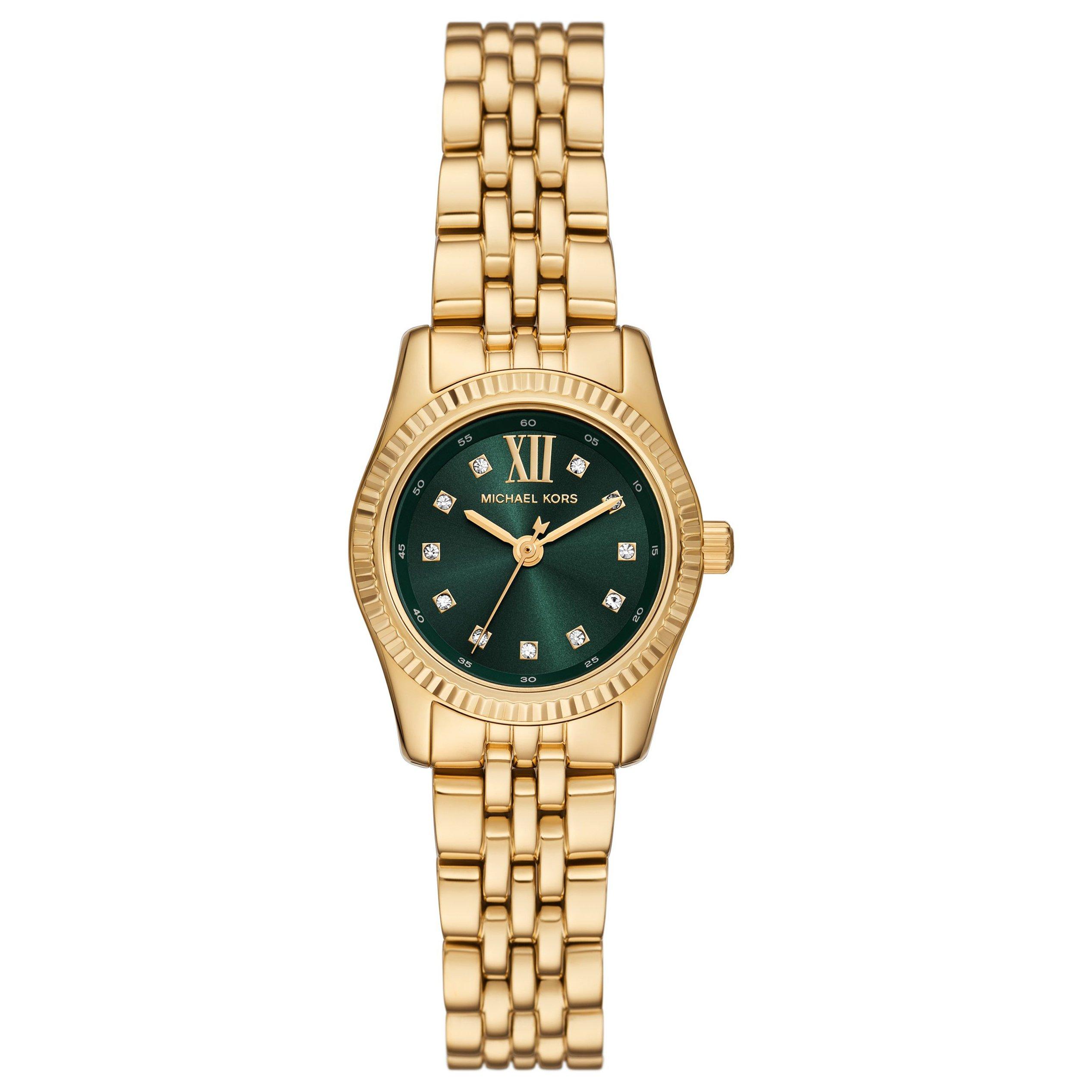 Captivating the eyes of everyone in the room with its striking green dial and yellow gold tone combination, this Michael Kors Lexington 26mm Yellow Gold Tone Ladies Watch sets the standard for designer style.