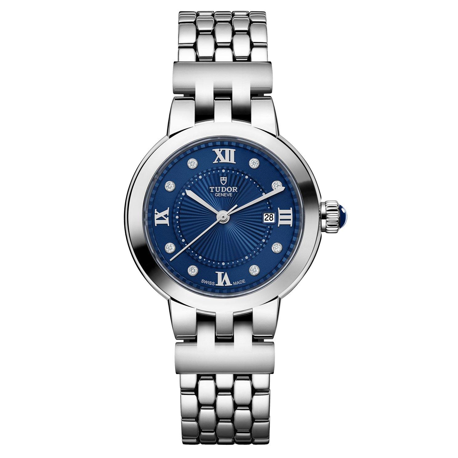 - Blue dial with stainless steel hands, roman numeral and diamond hour markers