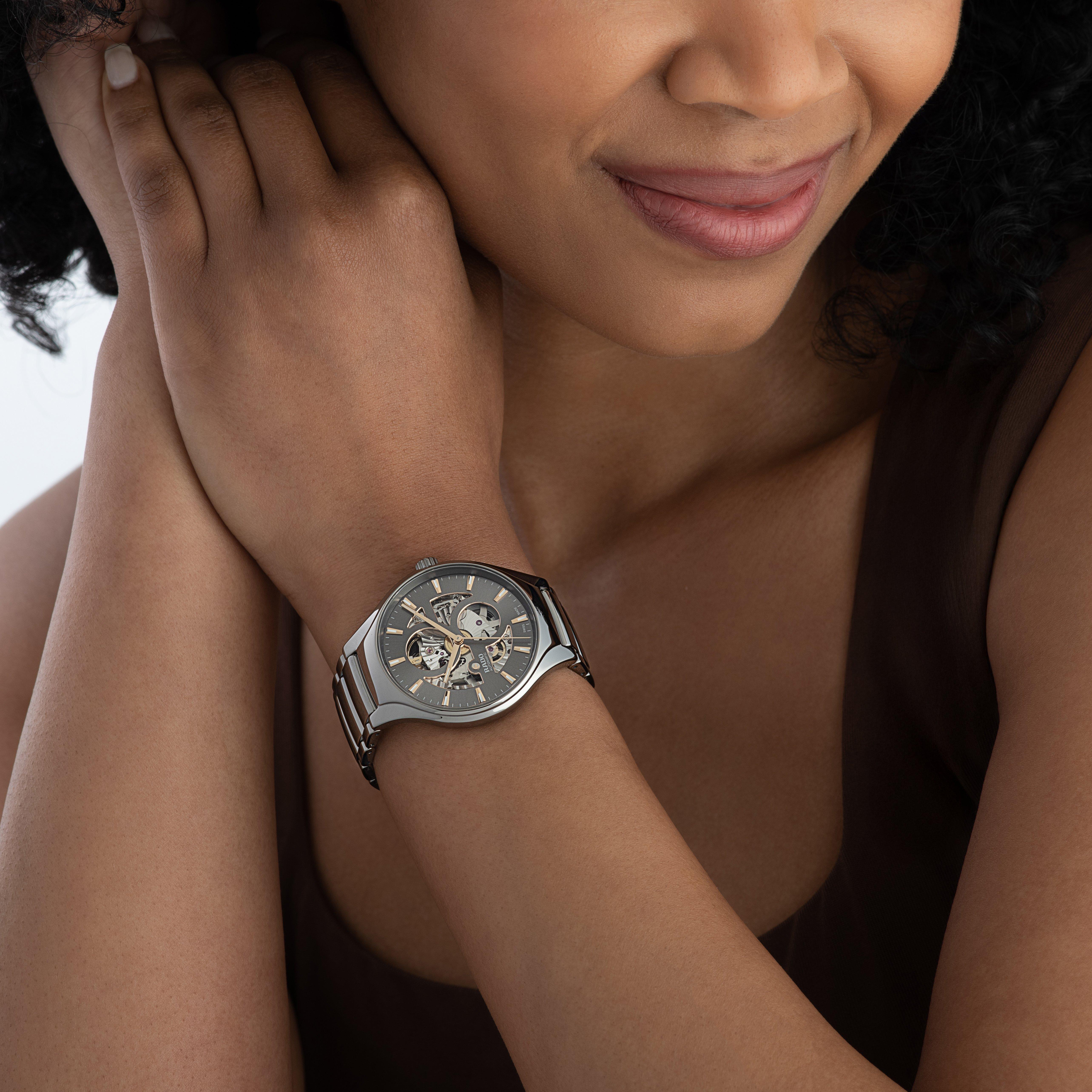 - Grey sunray skeleton dial with rose-gold-coloured bevels and a grey printed minute track