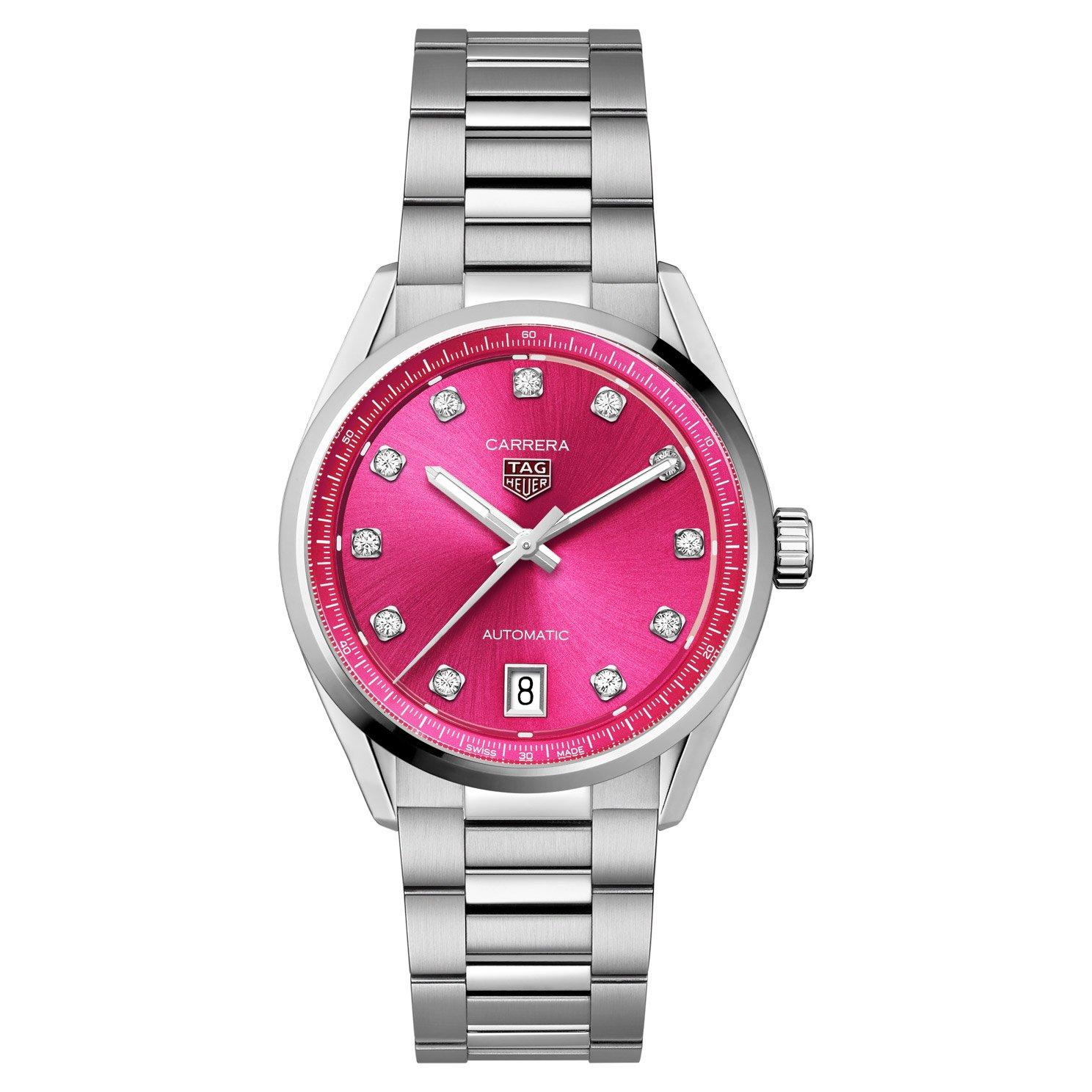 Discover the innovative world of watchmaking excellency with this TAG Heuer Carrera Date 36mm Diamond Automatic Ladies Watch. Designed with an unmissable pink dial, an exceptional movement and distinctive character, this timepiece is bold, bright and ready to take on any challenge.