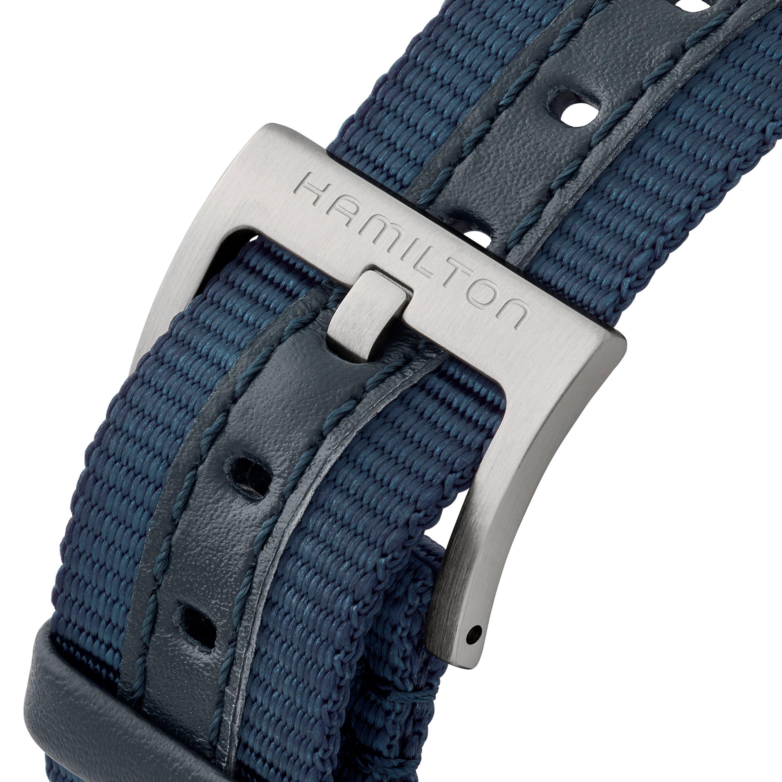 - Presented on a blue NATO textile strap and fastened with a pin buckle
