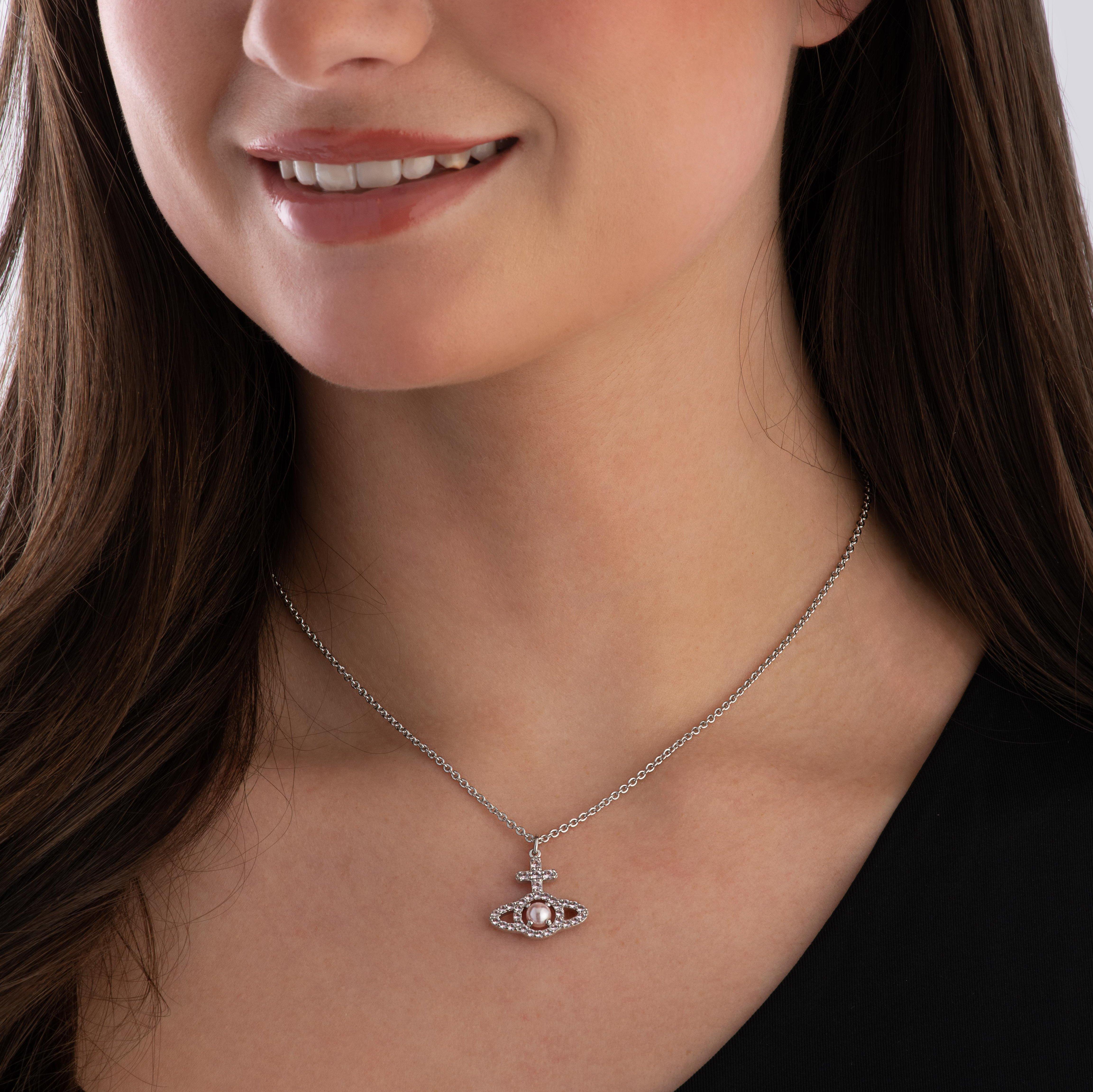 Indulge in iconic elegance with this Vivienne Westwood Olympia Silver Pearl Pendant. Adorned with the brands distinctive design details, this instantly recognisable piece makes a stylish statement.