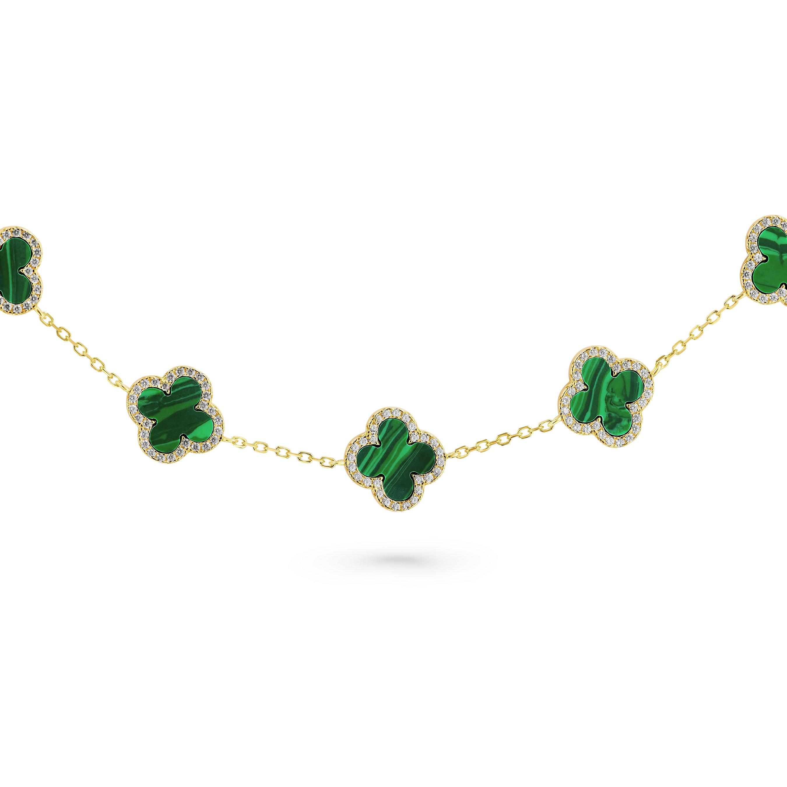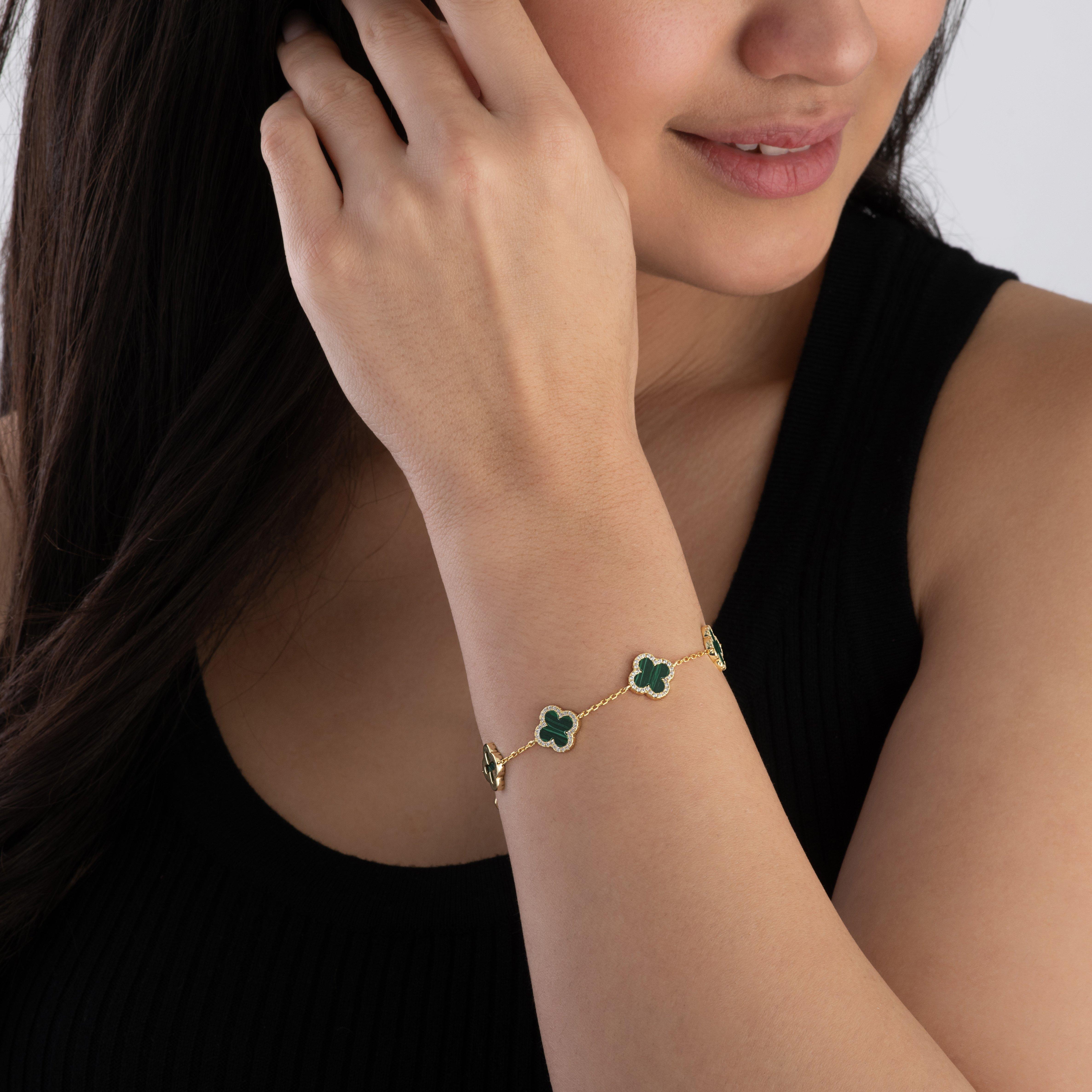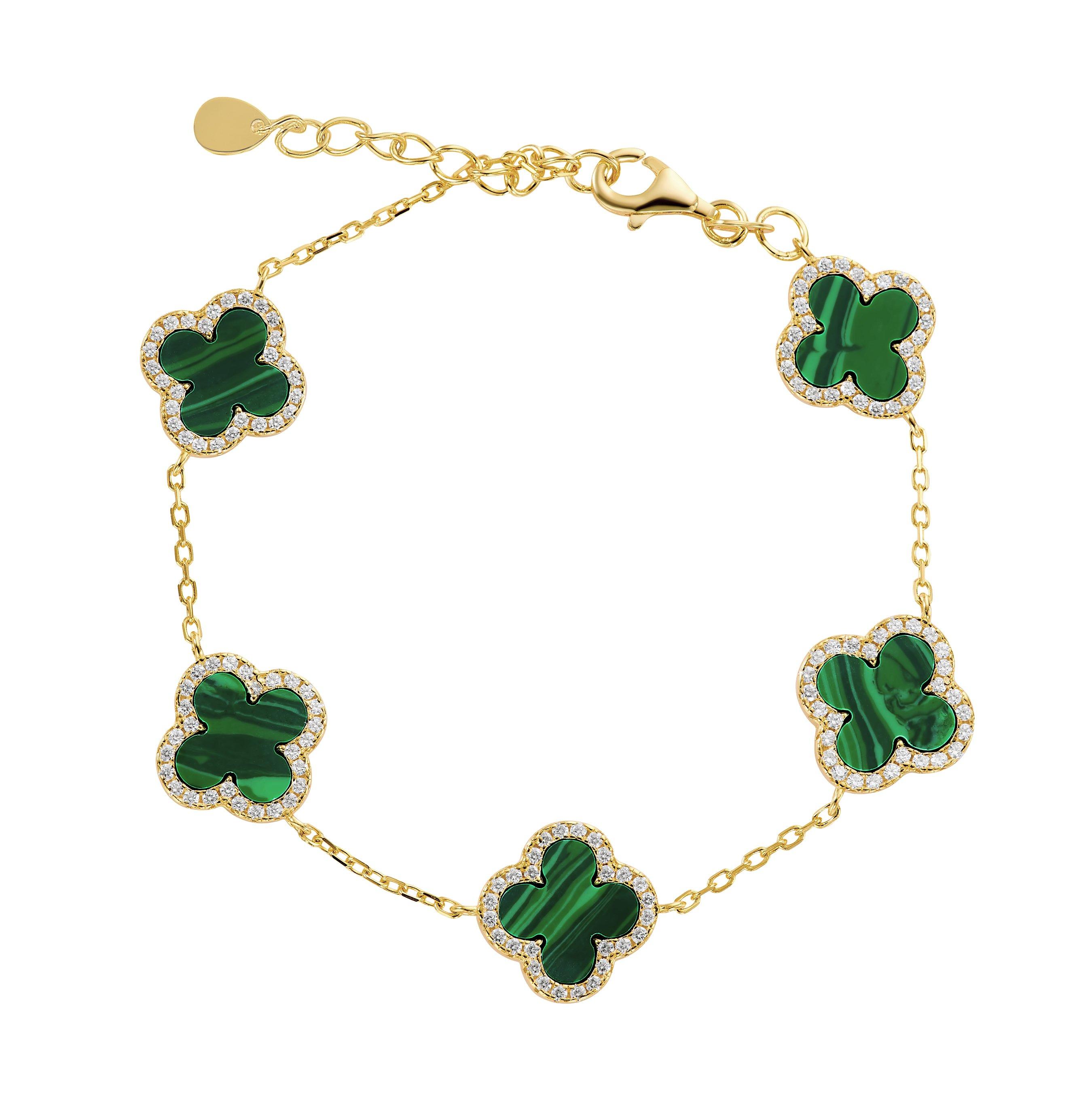 Indulge in the allure of elegance with this Yellow Gold Plated Cubic Zirconia Malachite Clover Bracelet. Effortlessly combining exquisite craftsmanship with a contemporary essence, add a touch of sparkle and unique charm to every look.