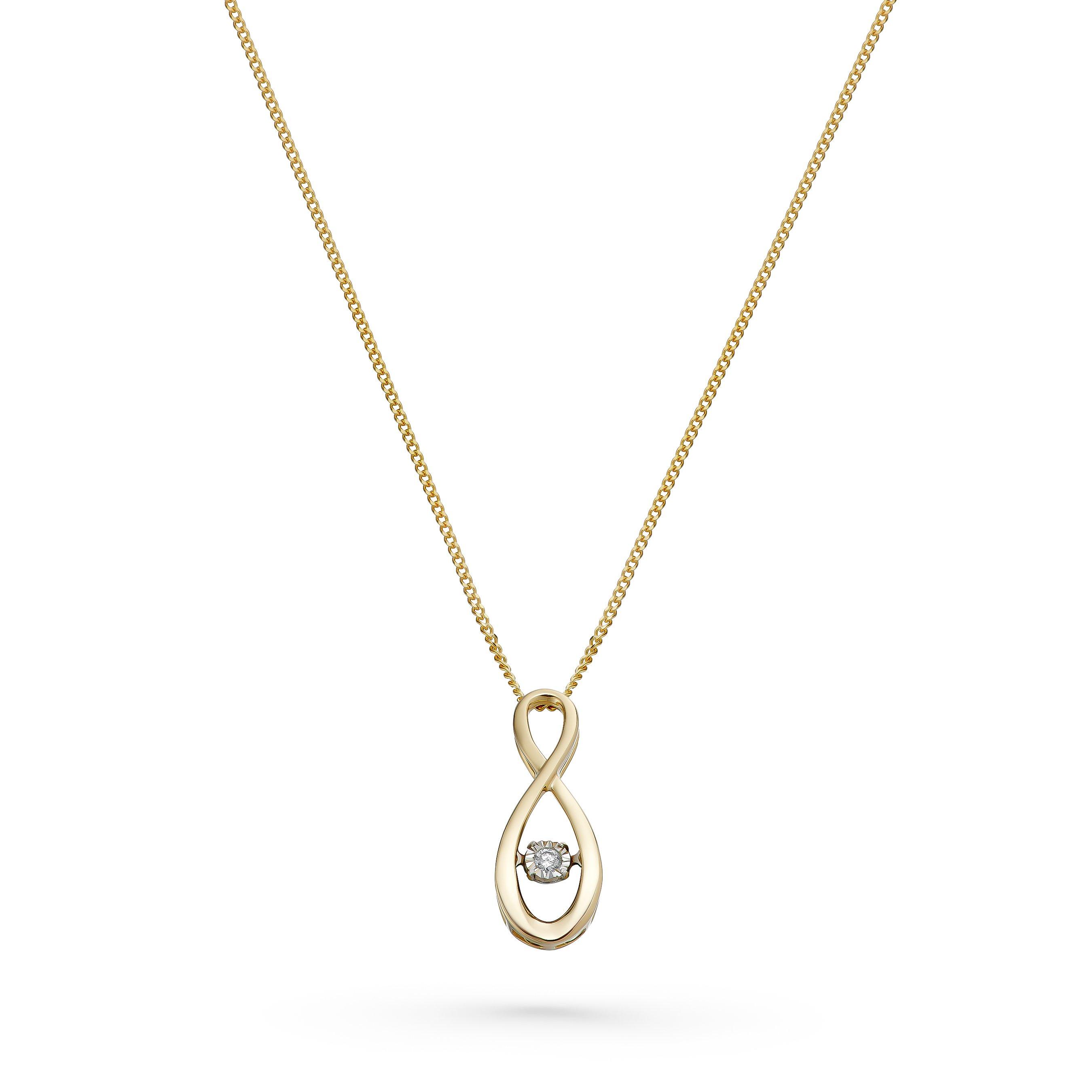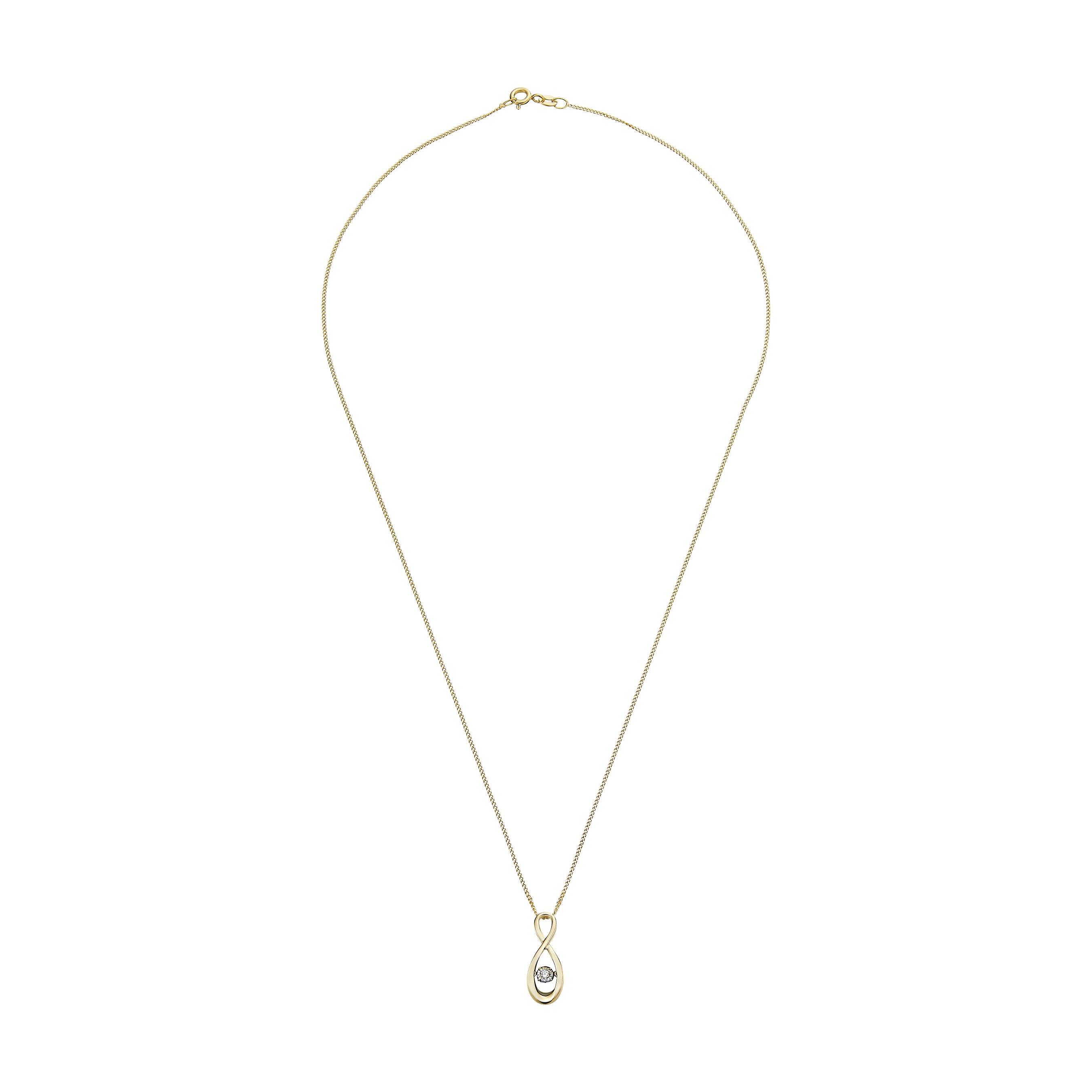 Symbolising everlasting love, this Dance 9ct Yellow Gold Diamond Pendant features an elegant infinity design with a single round brilliant diamond that gently moves within the setting catching the light with every movement and creating a sparkle that enhances the pendant’s graceful curves.Please note there may be a 5% variance in the carat weight, as every diamond is unique