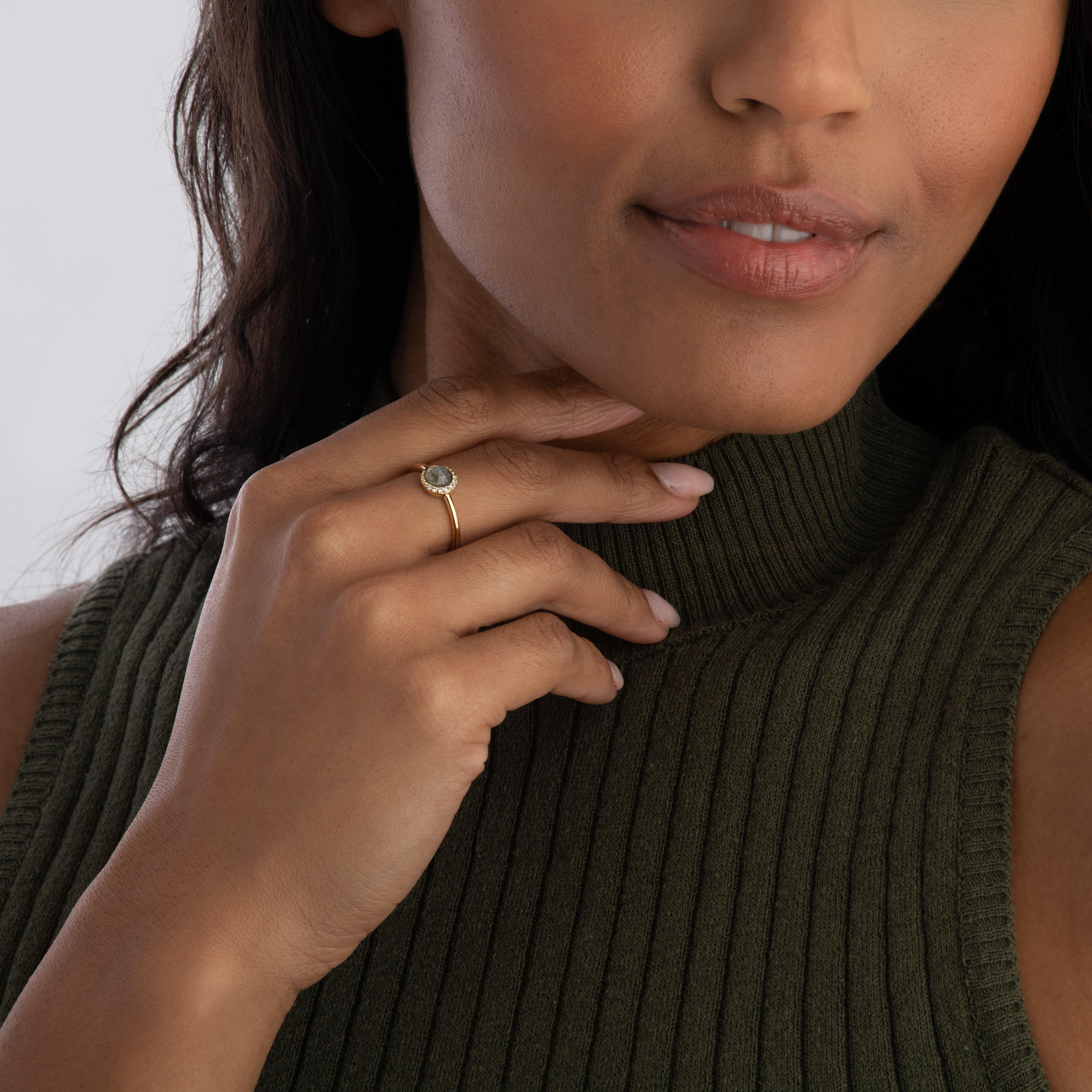 Radiating majestic lunar energy, this Astley Clarke Luna 18ct Yellow Gold Vermeil Labradorite Ring is bound to captivate everyone in the room with its lustrous detailing and celestial charm. Framed by a dazzling crescent of white sapphires, this ring is both sleek and delicate with just the right amount of contemporary allure.