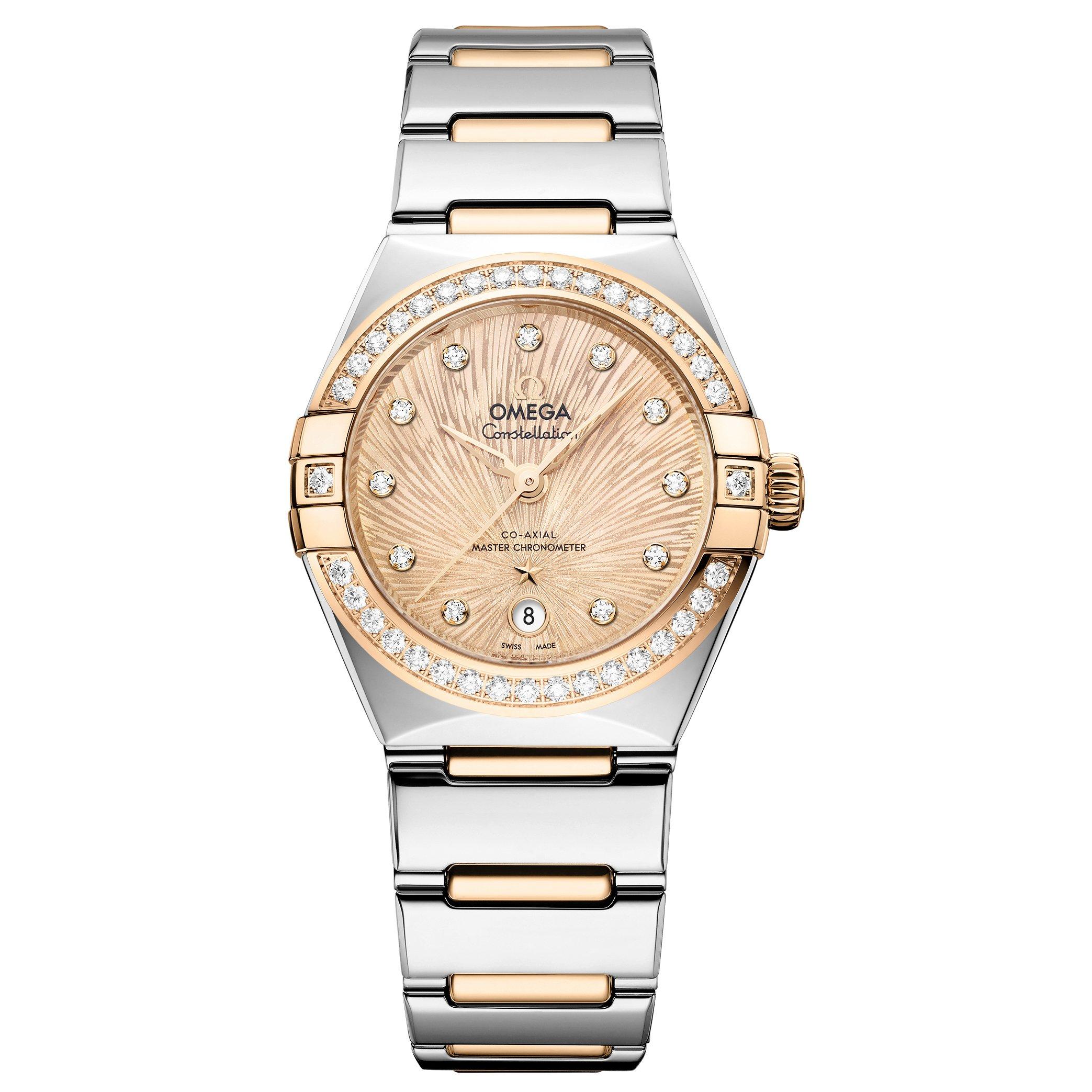 Mesmerising the heart and mind with its celestial spirit and elegant charm, this Omega Constellation 29mm Stainless Steel and 18K Moonshine Gold Diamond Ladies Watch is the ultimate timepiece for those with a passion for luxury. Featuring astounding design features such as a diamond embellished bezel and dial, captivating Moonshine gold detailing and an incredibly powerful movement that is inspired by the stars, this timepiece is designed to be cherished for a lifetime.