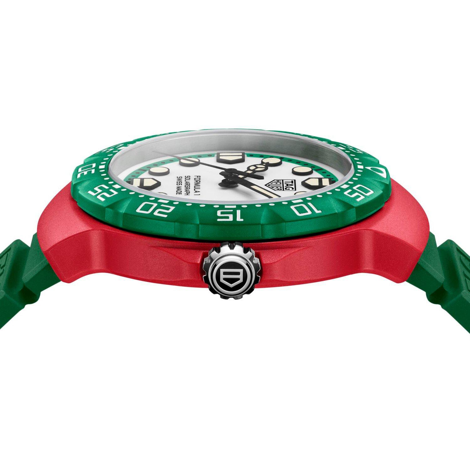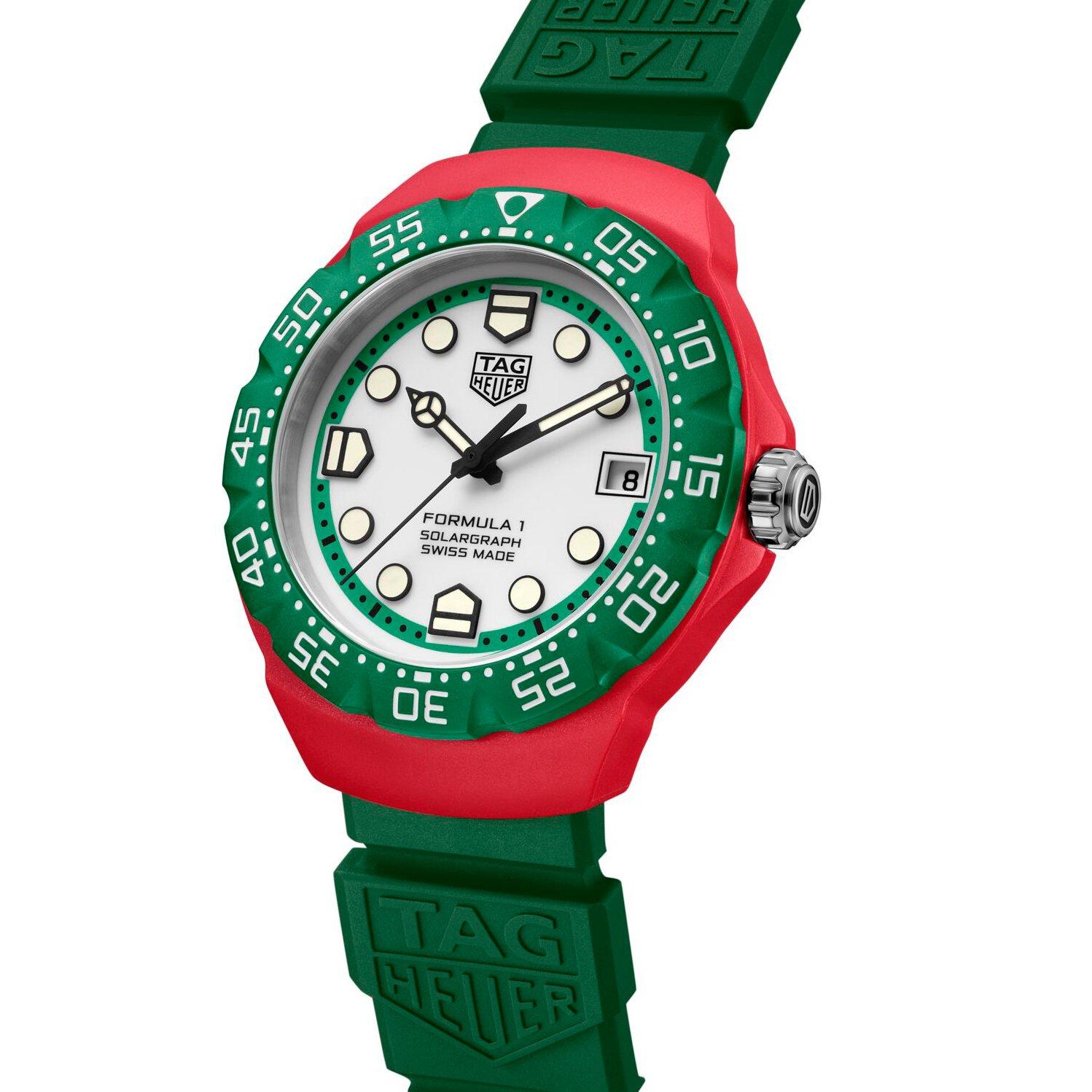 A bold colour-driven design comes to the forefront with this TAG Heuer Limited Edition Formula 1 Solargraph Men’s Watch with a breath-taking combination of red and green. Offering immense solar-powered performance and playful detailing, this timepiece is a thrilling addition to your luxury watch collection.
